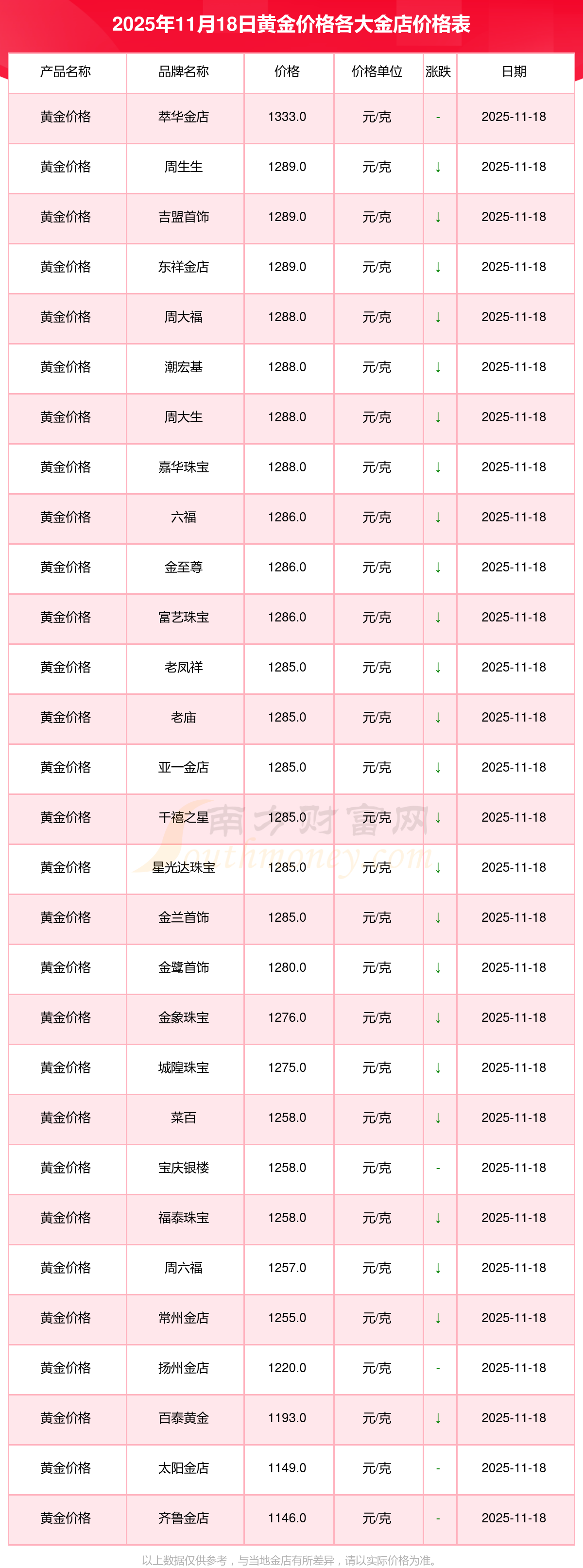 2025年11月18日,周大福、周大福、周大福、周大福、周大福、周大福、周大福、老凤祥、老凤祥、老凤祥、周六福等各大金店品牌黄金价格今日价格如下:周大福1288.0元/克、周大福626.0元/克、周大福1288.0元/克、周大福44770.0、周大福17820.0、周大福40390.0、周大福1127.0元/克、老凤祥1285.0元/克、老凤祥600.0元/克、老凤祥1285.0元/克、周六福1257.0元/克。