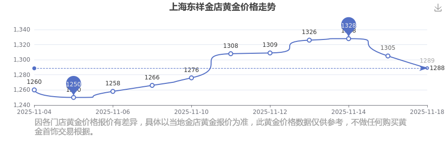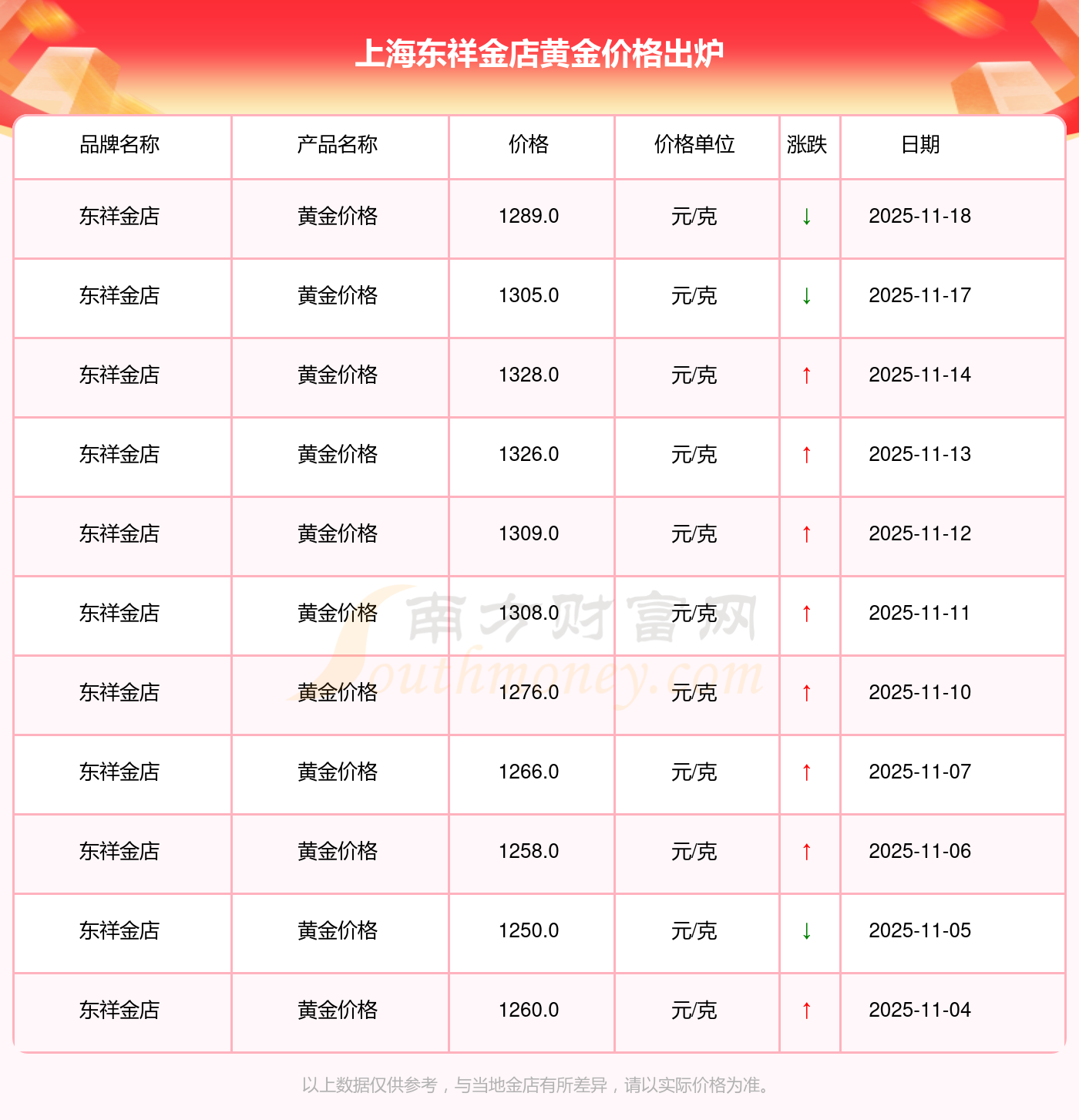 上海东祥金店黄金价格现在一克多少钱? 上海东祥金店黄金价格表,今日上海东祥金店黄金价格查询,2025年11月18日,今日上海东祥金店黄金价格:1289.0元/克。