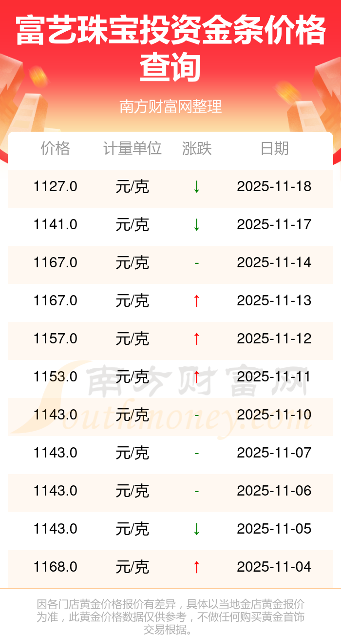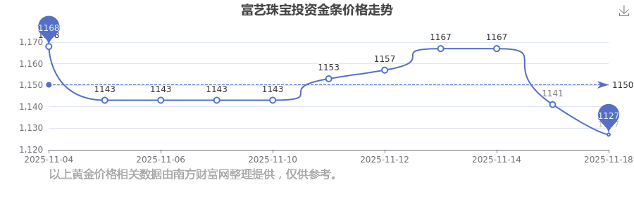 今日(2025年11月18日),富艺珠宝投资金条最新价格为1127.0元/克。