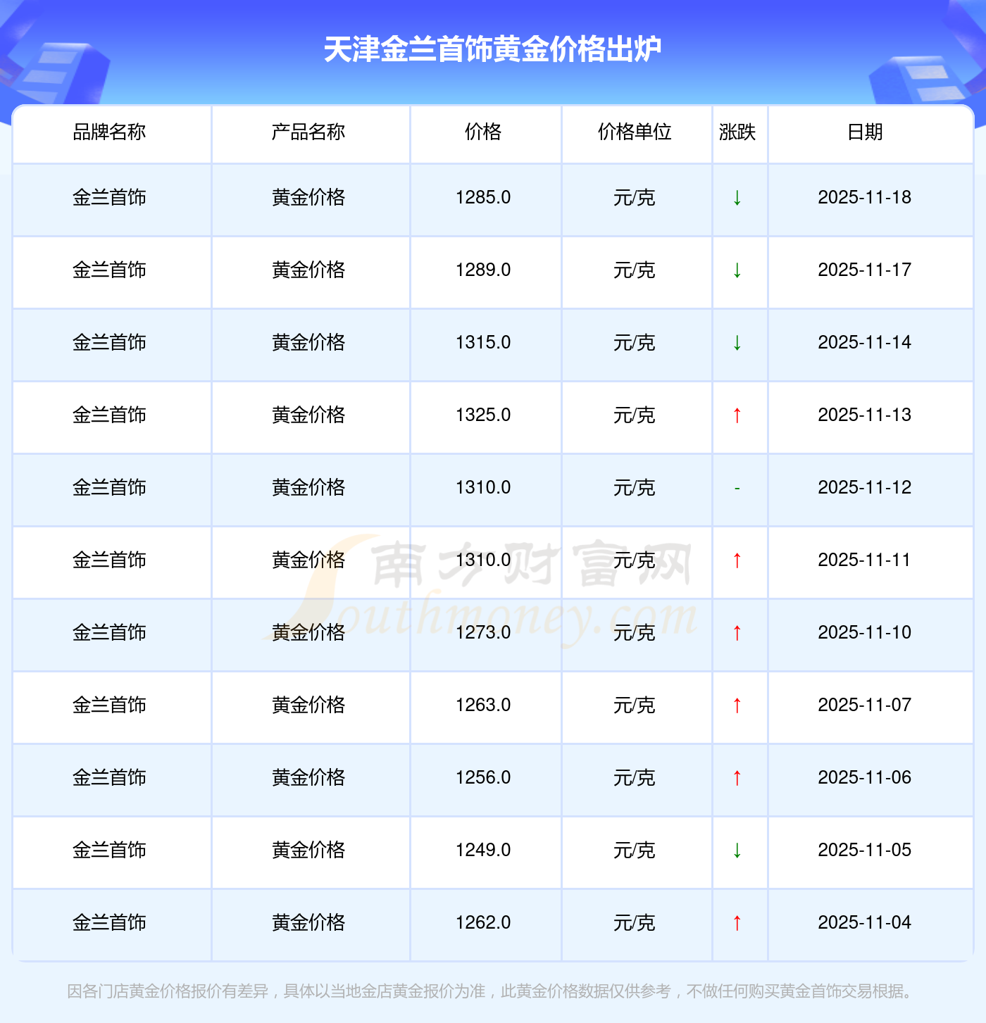 2025年11月18日周大福、周大福、周大福、周大福、周大福、周大福、周大福、老凤祥、老凤祥、老凤祥、周六福等各大金店品牌黄金价格最新价格如下:周大福黄金价格1288.0元/克,周大福铂金价格626.0元/克,周大福饰品金价(内地)1288.0元/克,周大福黄金饰品(香港)44770.0,周大福铂金价格(香港)17820.0,周大福金条价格(香港)40390.0,周大福金条金价(内地)1127.0元/克,老凤祥黄金价格1285.0元/克,老凤祥铂金价格600.0元/克,老凤祥足金价格1285.0元/克,周六福黄金价格1257.0元/克。