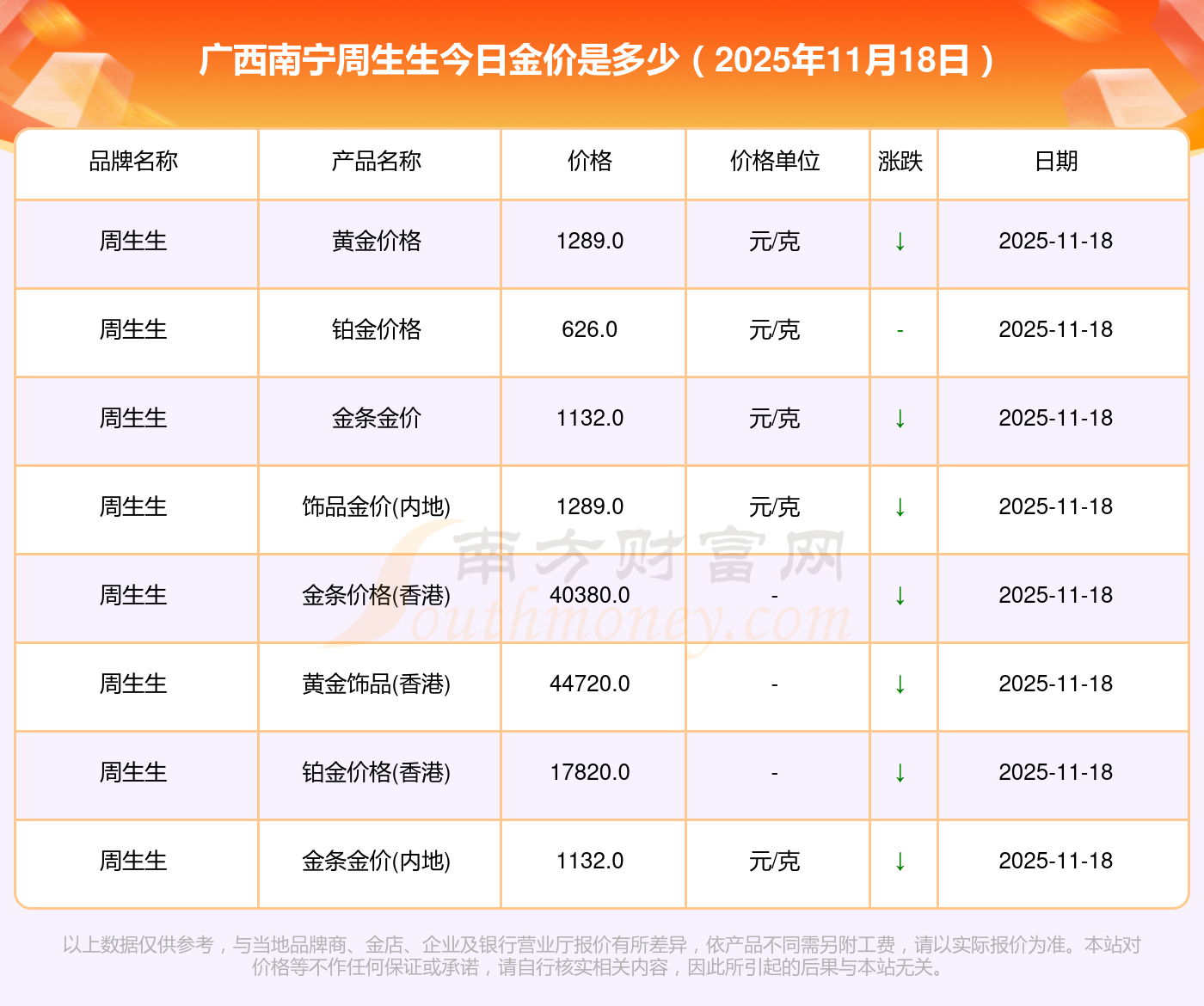2025年11月18日广西南宁周生生金价查询:黄金价格1288.0元/克,铂金价格626.0元/克,饰品金价(内地)1288.0元/克,黄金饰品(香港)44770.0,铂金价格(香港)17820.0,金条价格(香港)40390.0,金条金价(内地)1127.0元/克,黄金价格1285.0元/克,铂金价格600.0元/克,足金价格1285.0元/克,黄金价格1257.0元/克。