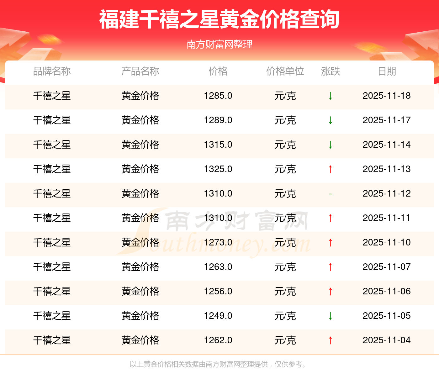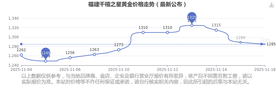 于 2025年11月18日,福建千禧之星黄金价格的克价为1285.0元/克。