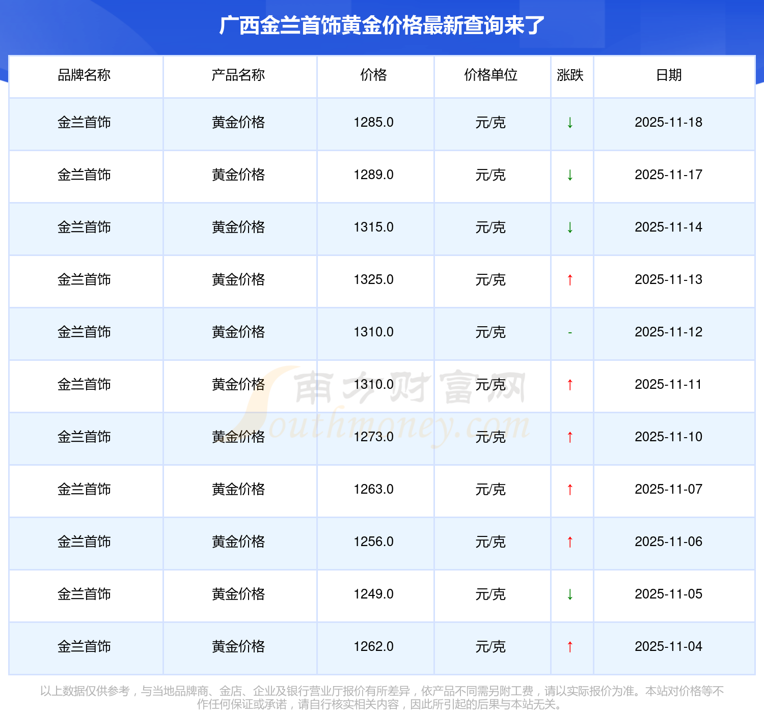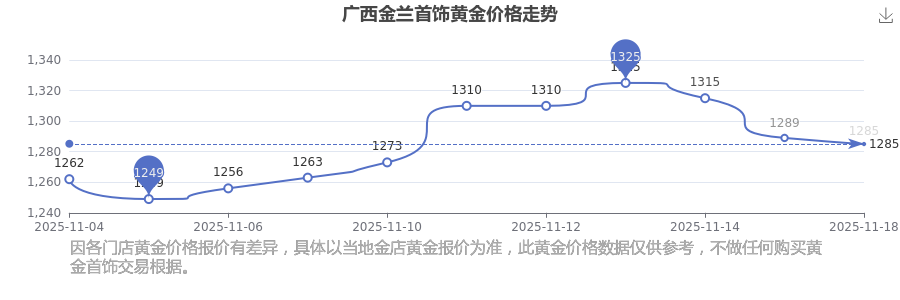 2025年11月18日,广西金兰首饰的黄金价格标价达到 1285.0元/克。