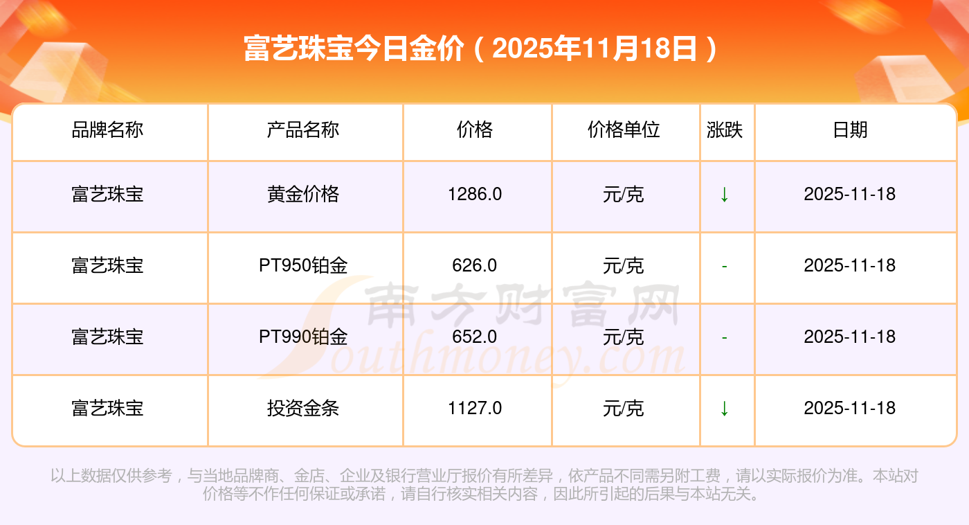 2025年11月18日富艺珠宝今日价格:黄金价格1288.0元/克,铂金价格626.0元/克,饰品金价(内地)1288.0元/克,黄金饰品(香港)44770.0,铂金价格(香港)17820.0,金条价格(香港)40390.0,金条金价(内地)1127.0元/克,黄金价格1285.0元/克,铂金价格600.0元/克,足金价格1285.0元/克,黄金价格1257.0元/克。