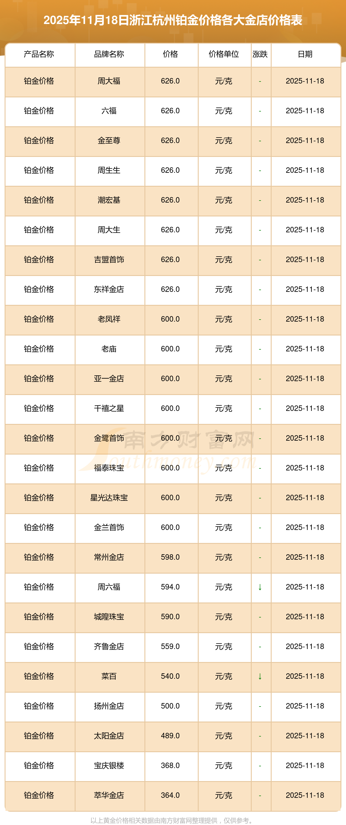 今天是2025年11月18日,浙江杭州周大福、周大福、周大福、周大福、周大福、周大福、周大福、老凤祥、老凤祥、老凤祥、周六福等各大金店品牌铂金价格最新价格如下:周大福1288.0元/克、周大福626.0元/克、周大福1288.0元/克、周大福44770.0、周大福17820.0、周大福40390.0、周大福1127.0元/克、老凤祥1285.0元/克、老凤祥600.0元/克、老凤祥1285.0元/克、周六福1257.0元/克。