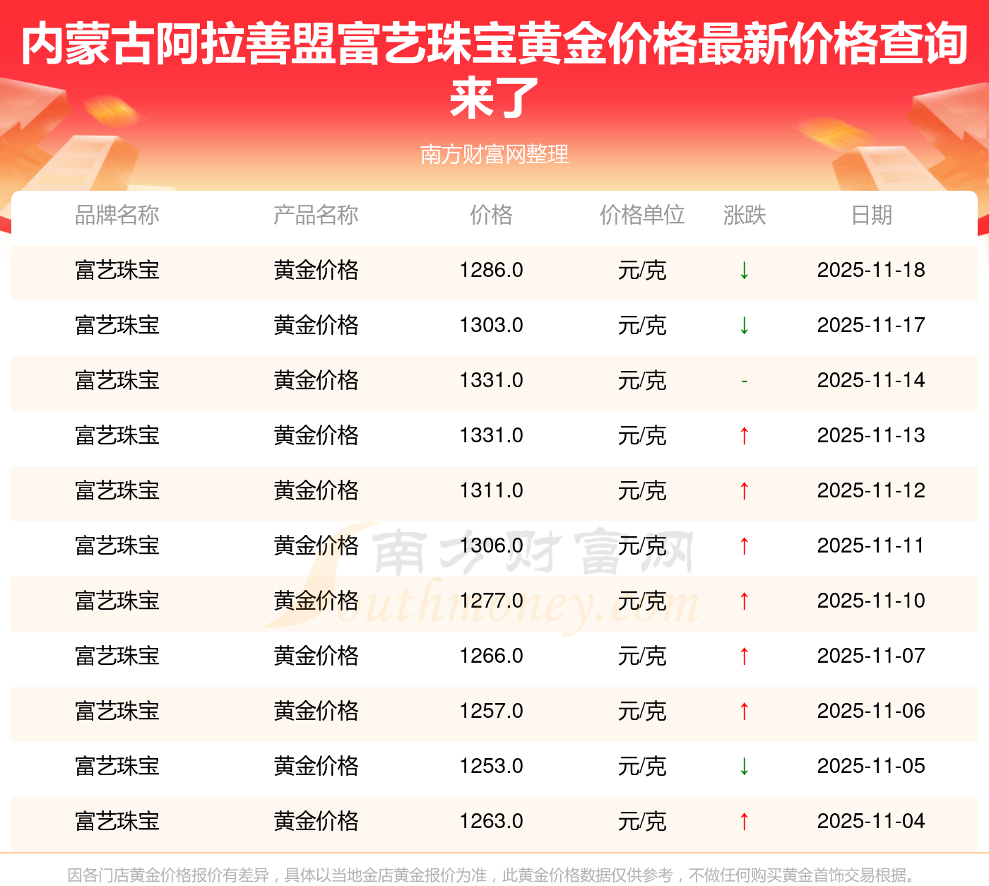 一、内蒙古阿拉善盟富艺珠宝黄金价格表来了