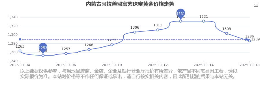 今日内蒙古阿拉善盟富艺珠宝黄金价格为1286.0元/克。