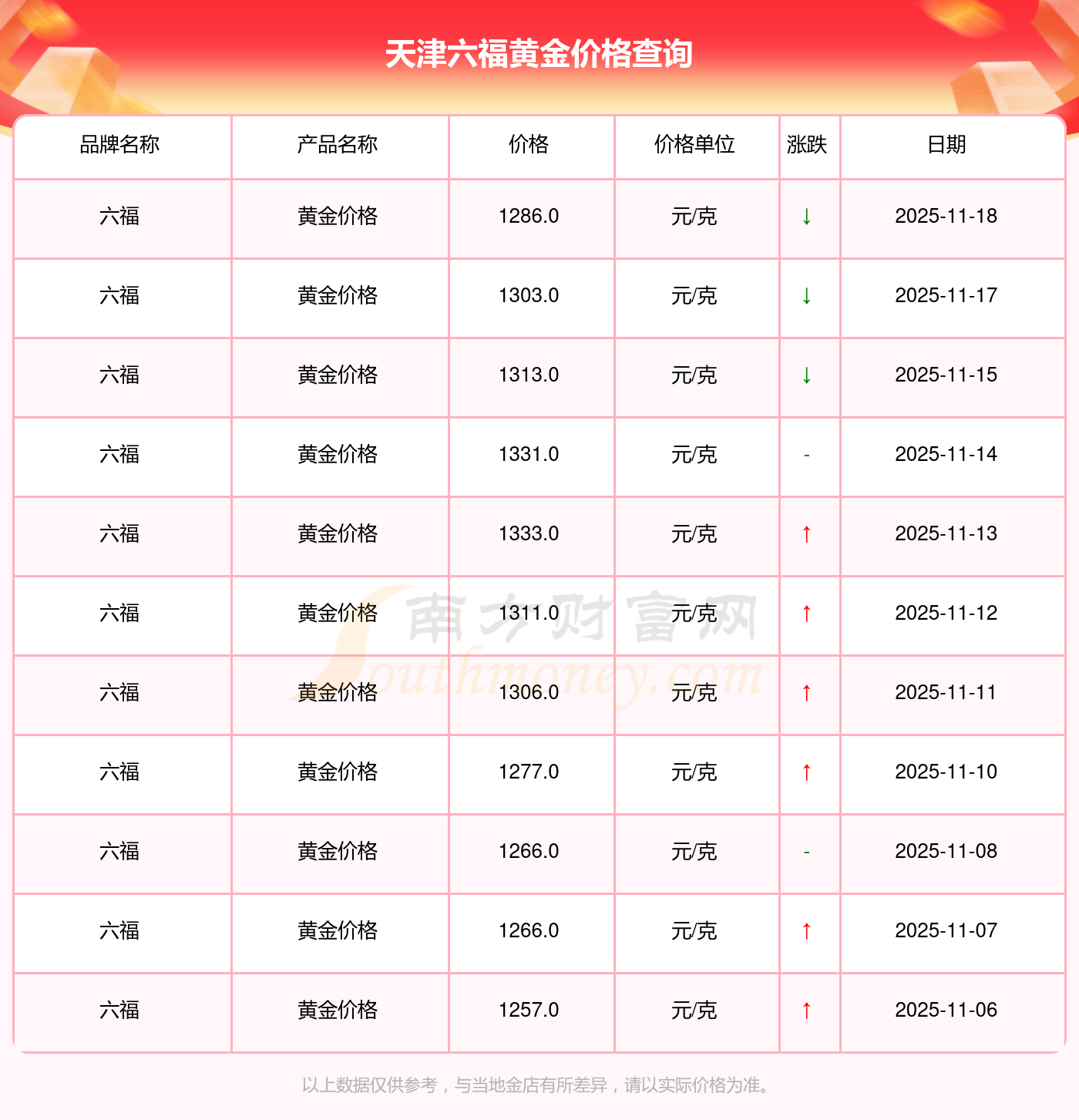 天津六福 2025年11月18日的黄金价格价位为 1286.0元/克。