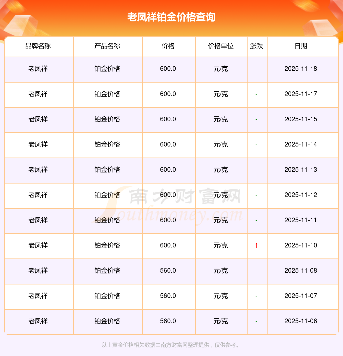 600.0元/克成为老凤祥今日 铂金价格的最新交易的价格。