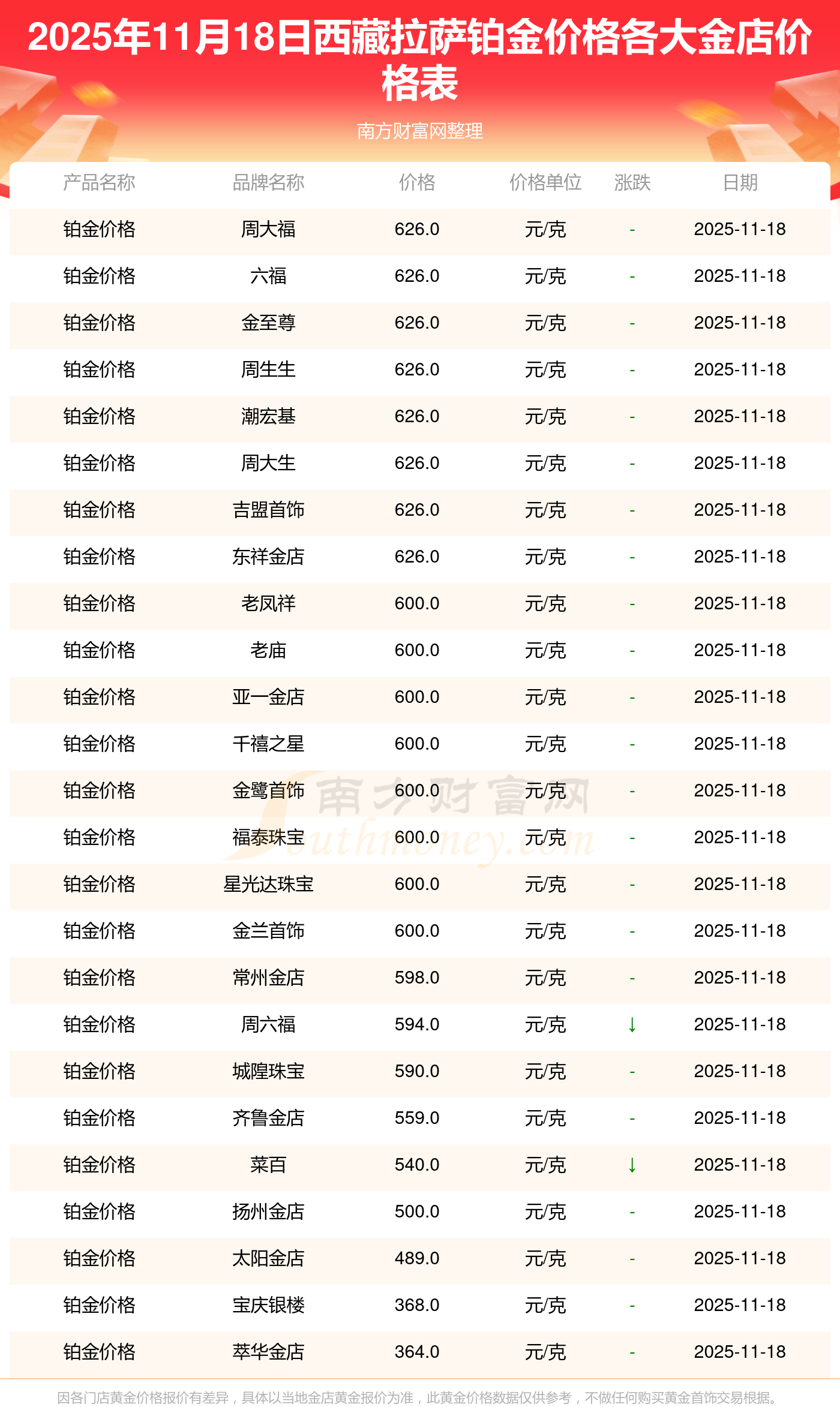 2025年11月18日西藏拉萨各大金店铂金价格最新价格:周大福1288.0元/克,周大福626.0元/克,周大福1288.0元/克,周大福44770.0,周大福17820.0,周大福40390.0,周大福1127.0元/克,老凤祥1285.0元/克,老凤祥600.0元/克,老凤祥1285.0元/克,周六福1257.0元/克。