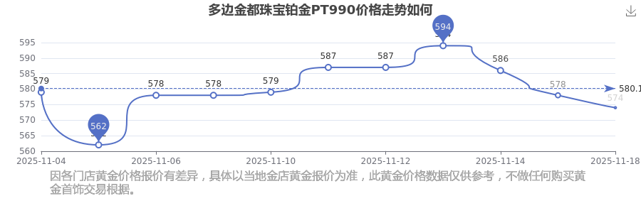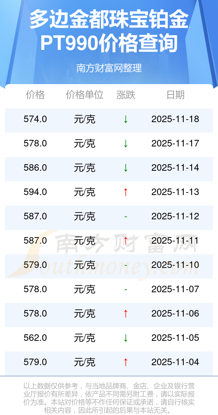 今日(2025年11月18日),多边金都珠宝铂金PT990最新价格是574.0元/克。
