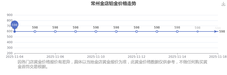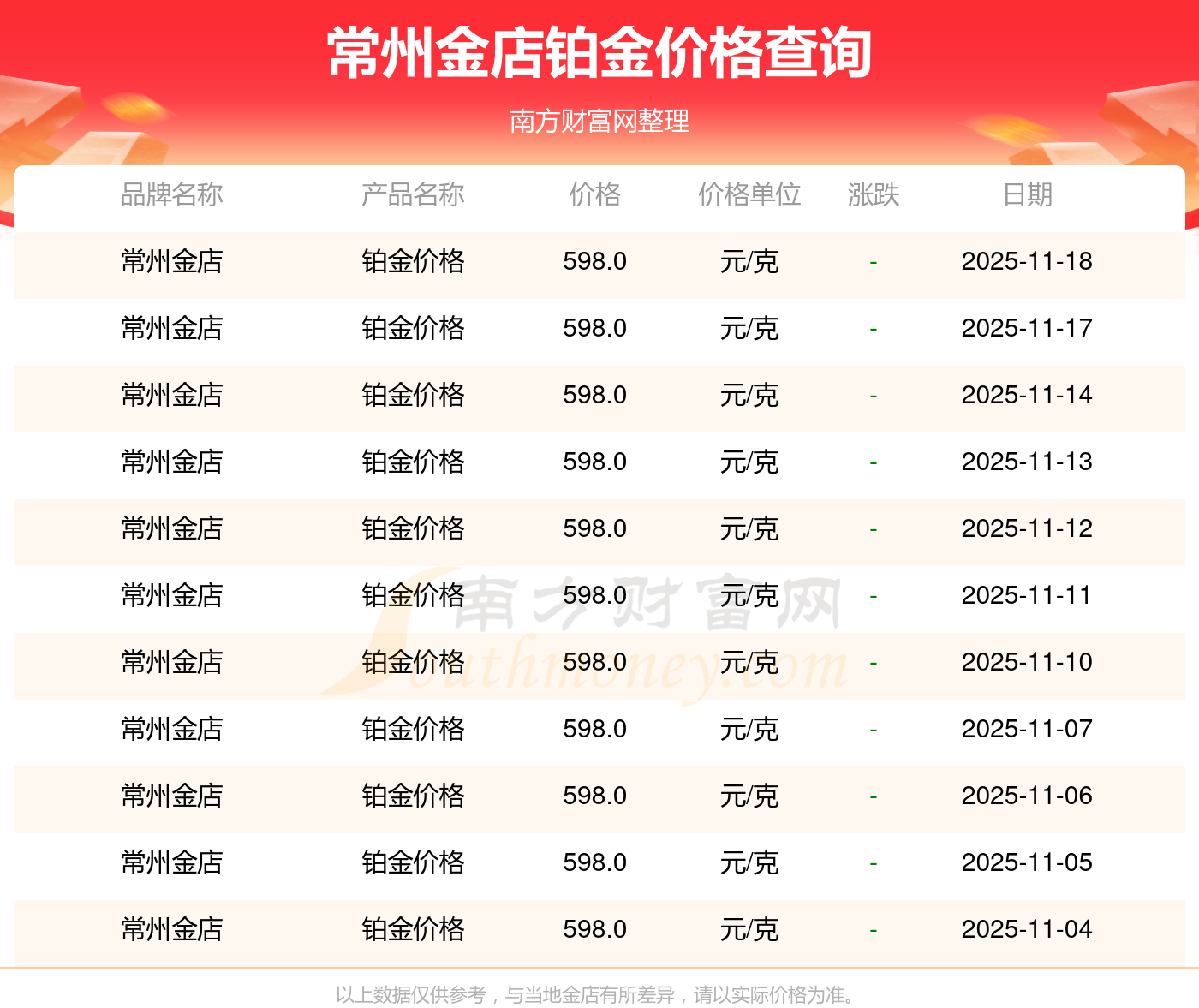 今日(2025年11月18日)常州金店铂金价格的价格为598.0元/克。