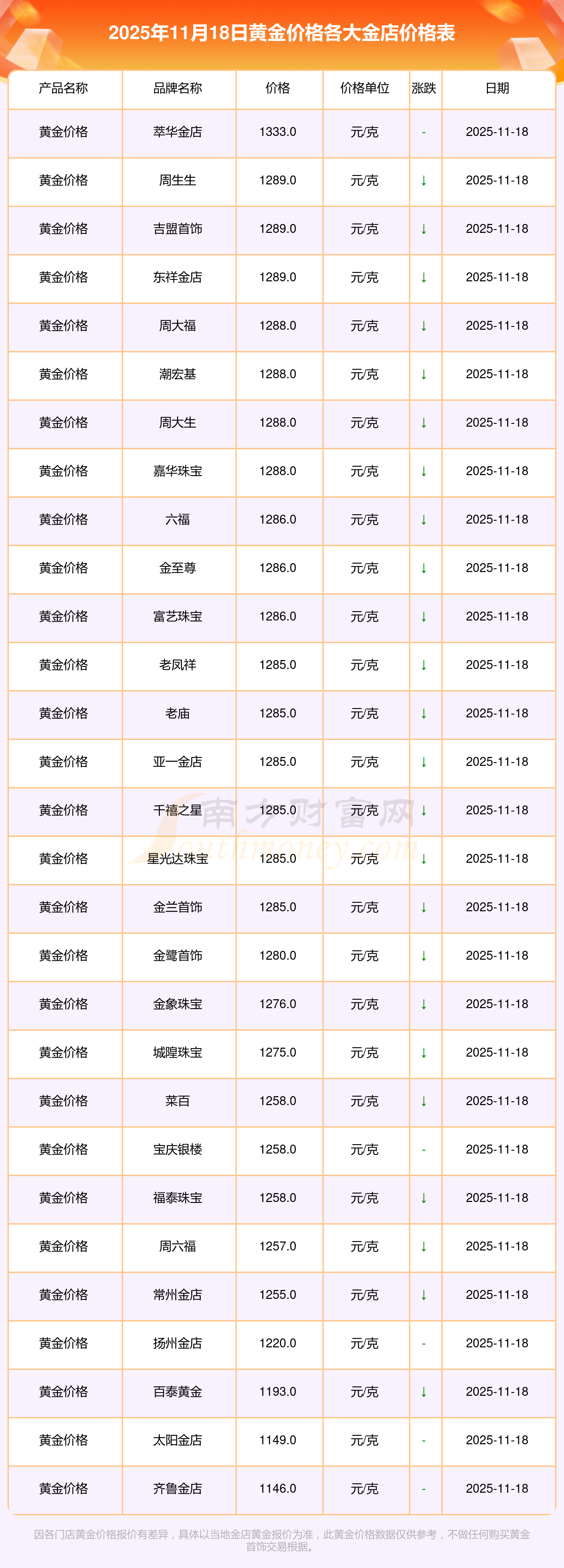 2025年11月18日,周大福、周大福、周大福、周大福、周大福、周大福、周大福、老凤祥、老凤祥、老凤祥、周六福等各大金店品牌黄金价格今日价格如下:周大福1288.0元/克、周大福626.0元/克、周大福1288.0元/克、周大福44770.0、周大福17820.0、周大福40390.0、周大福1127.0元/克、老凤祥1285.0元/克、老凤祥600.0元/克、老凤祥1285.0元/克、周六福1257.0元/克。