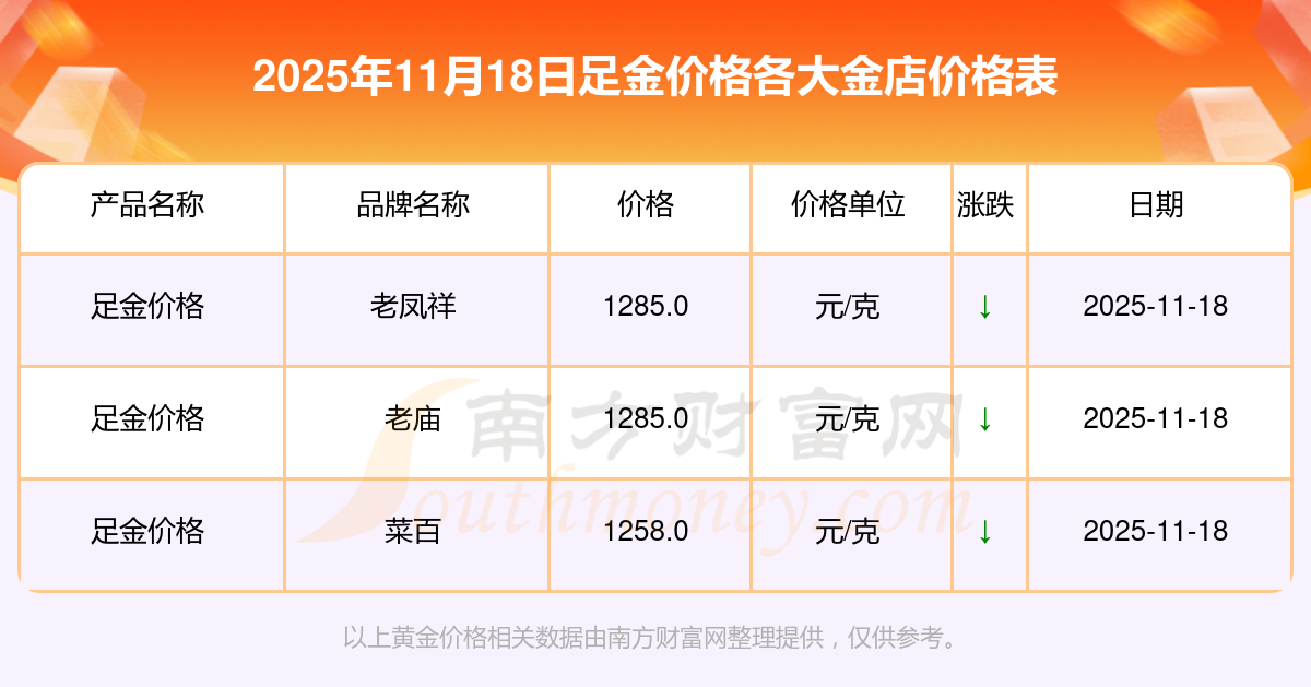 今天是2025年11月18日,周大福、周大福、周大福、周大福、周大福、周大福、周大福、老凤祥、老凤祥、老凤祥、周六福等各大金店品牌足金价格最新价格如下:周大福1288.0元/克、周大福626.0元/克、周大福1288.0元/克、周大福44770.0、周大福17820.0、周大福40390.0、周大福1127.0元/克、老凤祥1285.0元/克、老凤祥600.0元/克、老凤祥1285.0元/克、周六福1257.0元/克。