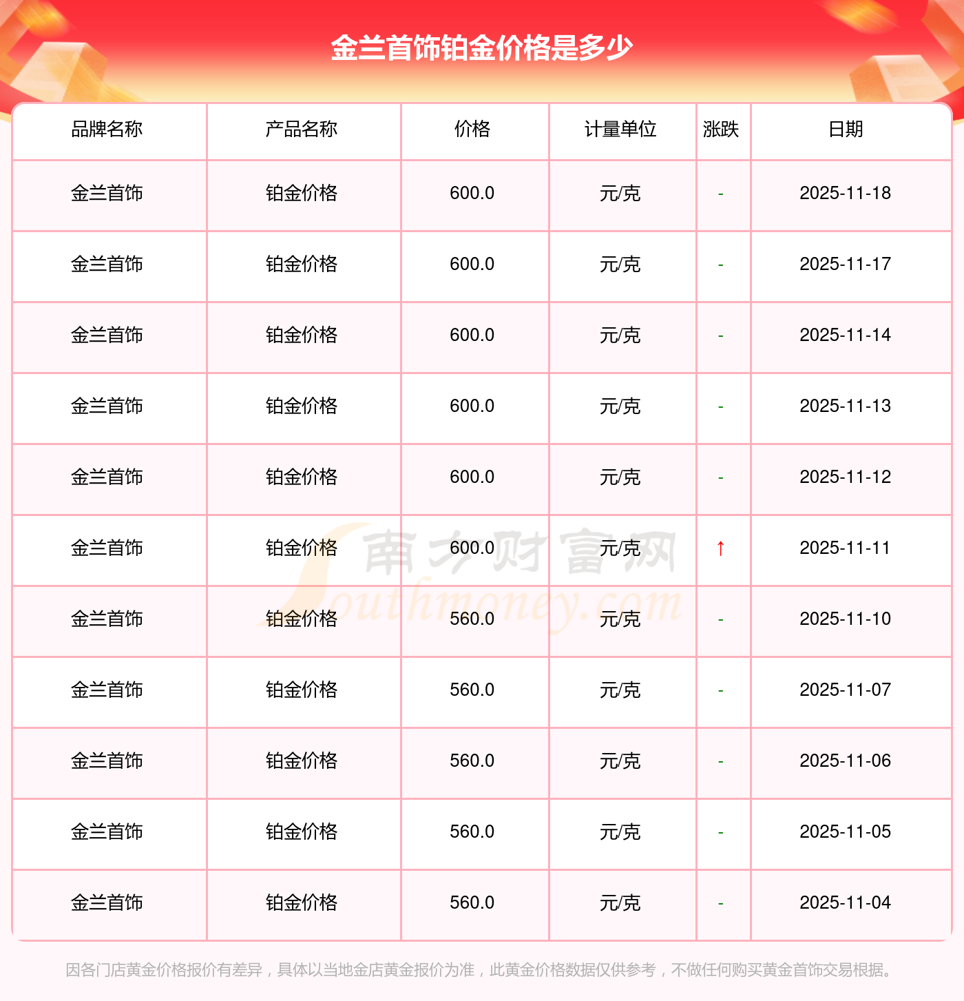 今日金兰首饰 铂金价格的最新定价为600.0元/克。