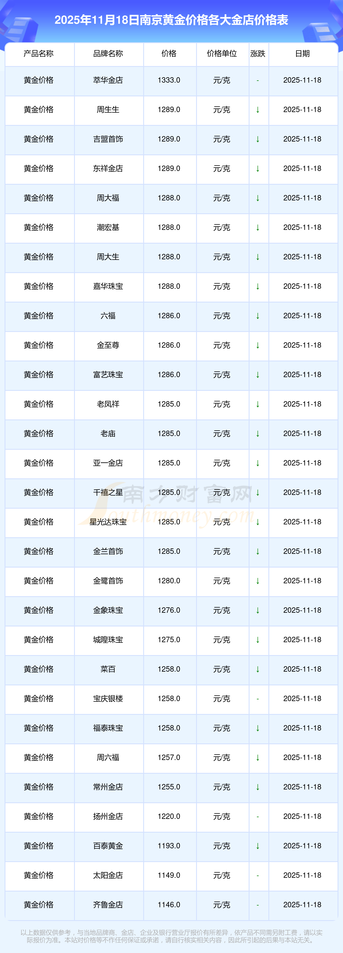 2025年11月18日南京各大金店黄金价格最新价格查询来了:周大福1288.0元/克,周大福626.0元/克,周大福1288.0元/克,周大福44770.0,周大福17820.0,周大福40390.0,周大福1127.0元/克,老凤祥1285.0元/克,老凤祥600.0元/克,老凤祥1285.0元/克,周六福1257.0元/克。