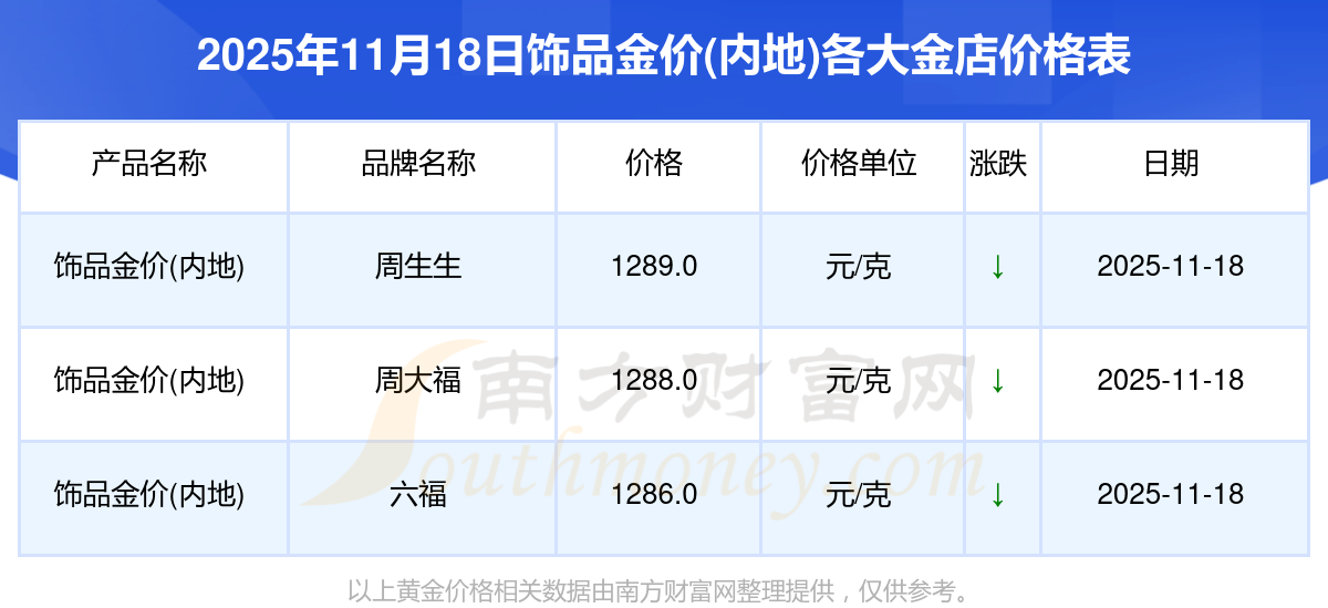 今日饰品金价(内地)表_2025年11月18日各金店饰品金价(内地)多少1克?一起来看看吧!