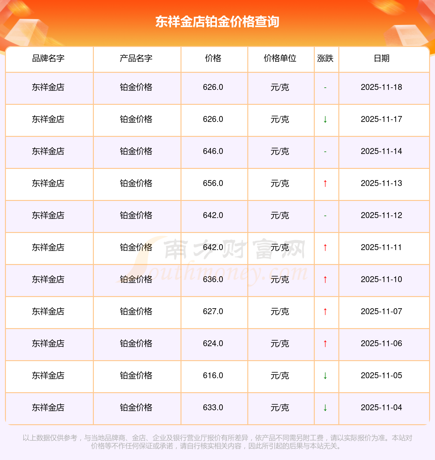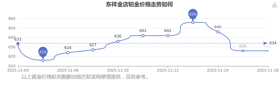 今日东祥金店铂金价格为626.0元/克。