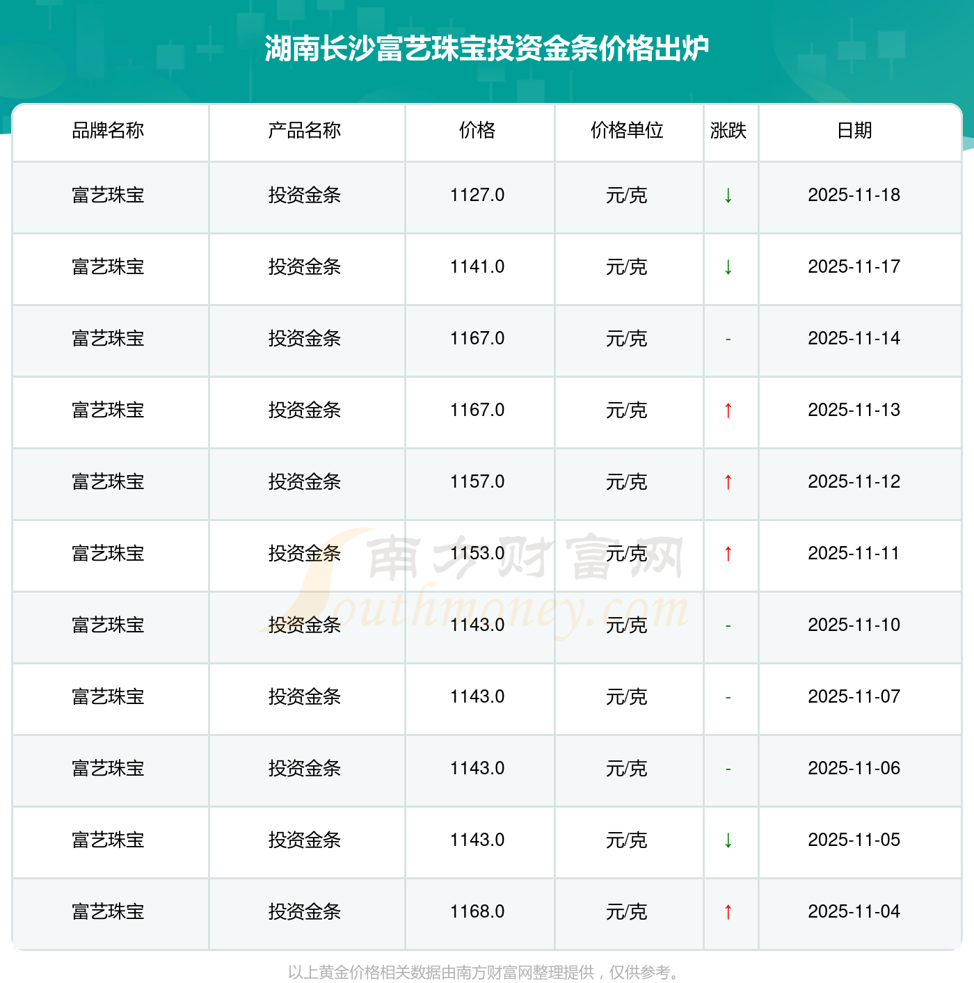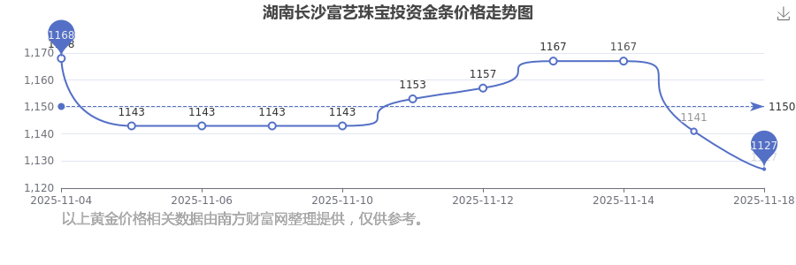 2025年11月18日,湖南长沙富艺珠宝所售投资金条,其价格设定为 1127.0元/克。