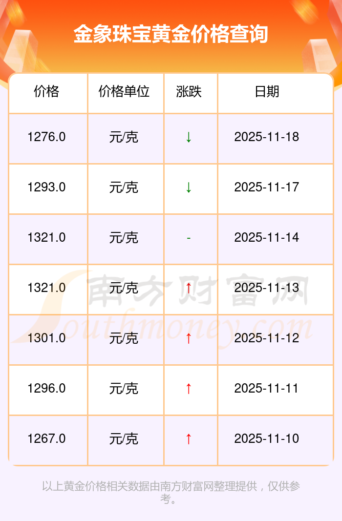 想知道今日黄金价格,目前黄金一克的价钱是多少呀?属于优良导电导热材料的黄金,具备良好的导热特性。鉴于其化学稳定性高、抗氧化性强,能够制作高精度电子元件,故而在电子工业的特殊电路设计中常用到它。今日(2025年11月18日)金象珠宝黄金价格为1276.0元/克。
