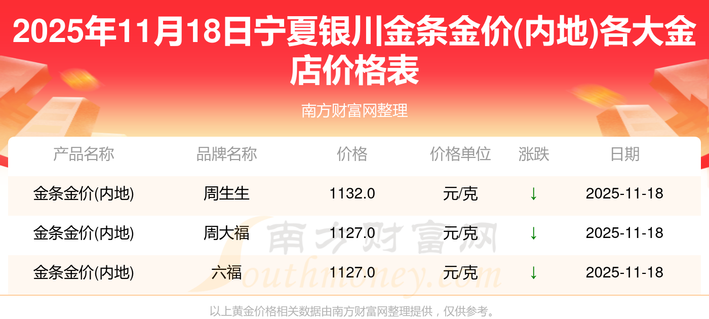 2025年11月18日宁夏银川周大福、周大福、周大福、周大福、周大福、周大福、周大福、老凤祥、老凤祥、老凤祥、周六福等各大金店品牌金条金价(内地)最新价格如下:周大福黄金价格1288.0元/克,周大福铂金价格626.0元/克,周大福饰品金价(内地)1288.0元/克,周大福黄金饰品(香港)44770.0,周大福铂金价格(香港)17820.0,周大福金条价格(香港)40390.0,周大福金条金价(内地)1127.0元/克,老凤祥黄金价格1285.0元/克,老凤祥铂金价格600.0元/克,老凤祥足金价格1285.0元/克,周六福黄金价格1257.0元/克。