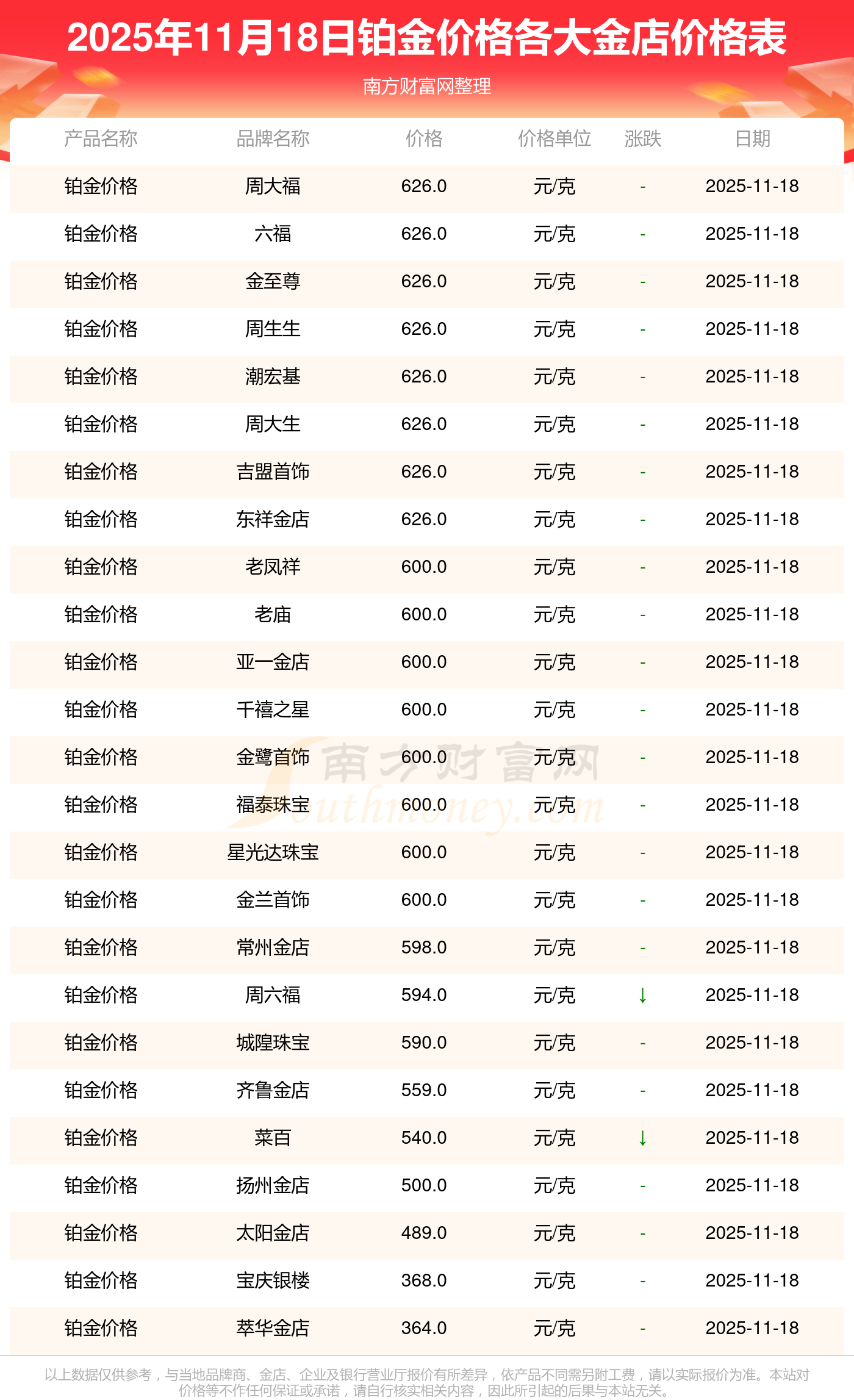 2025年11月18日各大金店铂金价格多少1克?各大金店铂金价格报价表