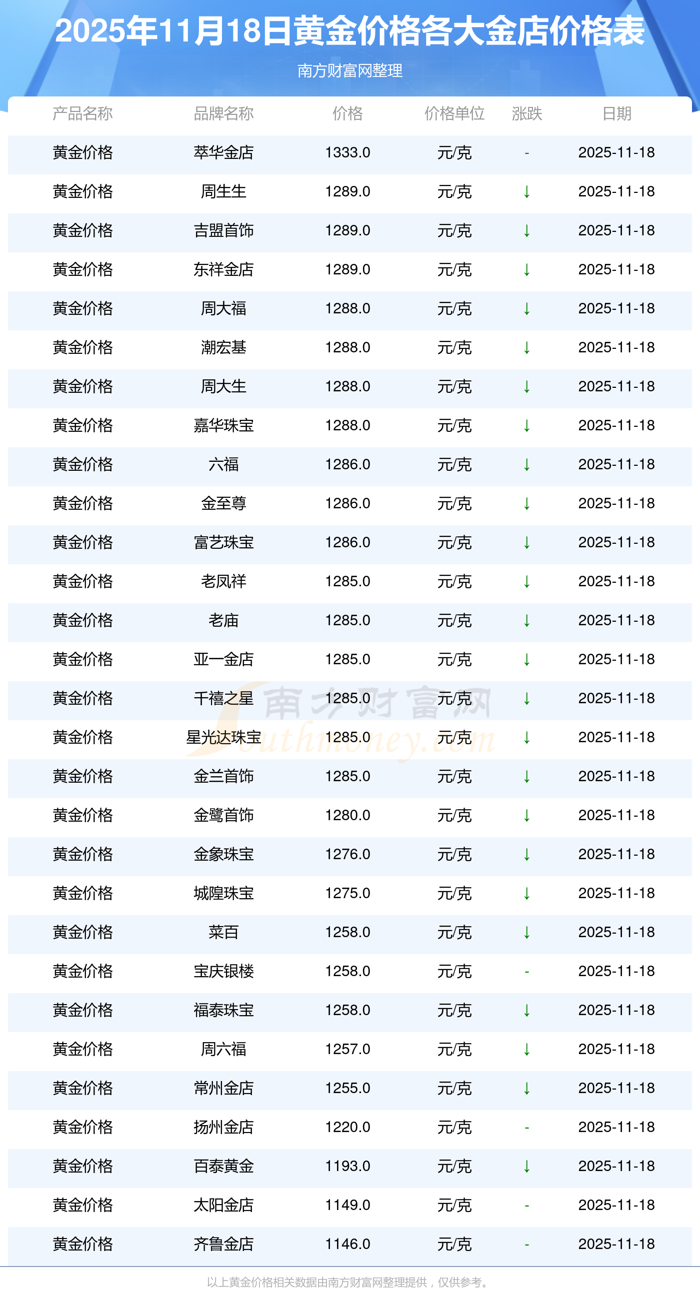 2025年11月18日各大金店黄金价格最新价格:周大福1288.0元/克,周大福626.0元/克,周大福1288.0元/克,周大福44770.0,周大福17820.0,周大福40390.0,周大福1127.0元/克,老凤祥1285.0元/克,老凤祥600.0元/克,老凤祥1285.0元/克,周六福1257.0元/克。