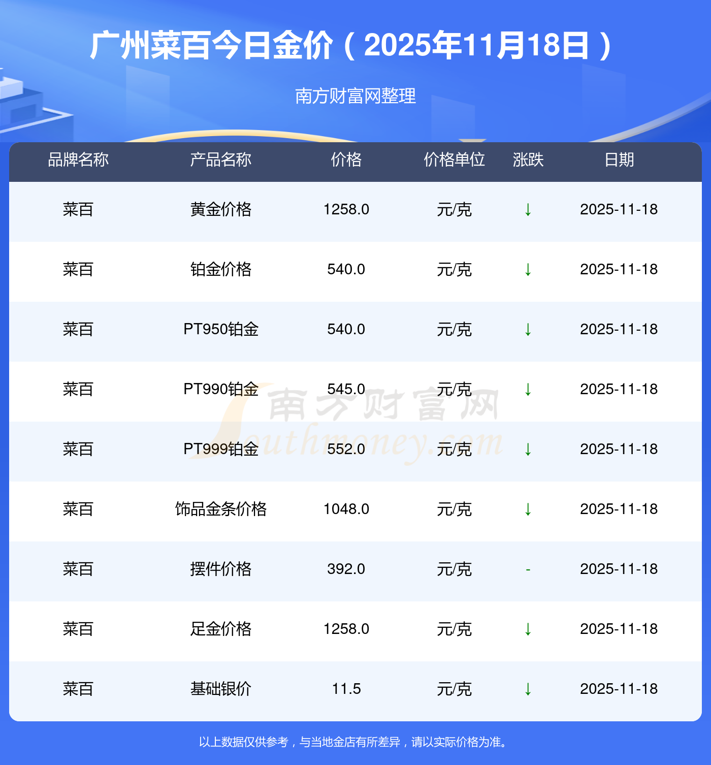 2025年11月18日广州菜百今日价格:黄金价格1288.0元/克,铂金价格626.0元/克,饰品金价(内地)1288.0元/克,黄金饰品(香港)44770.0,铂金价格(香港)17820.0,金条价格(香港)40390.0,金条金价(内地)1127.0元/克,黄金价格1285.0元/克,铂金价格600.0元/克,足金价格1285.0元/克,黄金价格1257.0元/克。