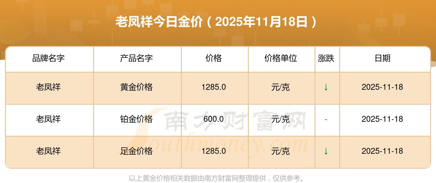 2025年11月18日周大福、周大福、周大福、周大福、周大福、周大福、周大福、老凤祥、老凤祥、老凤祥、周六福等各大金店品牌足金价格最新价格如下:周大福黄金价格1288.0元/克,周大福铂金价格626.0元/克,周大福饰品金价(内地)1288.0元/克,周大福黄金饰品(香港)44770.0,周大福铂金价格(香港)17820.0,周大福金条价格(香港)40390.0,周大福金条金价(内地)1127.0元/克,老凤祥黄金价格1285.0元/克,老凤祥铂金价格600.0元/克,老凤祥足金价格1285.0元/克,周六福黄金价格1257.0元/克。