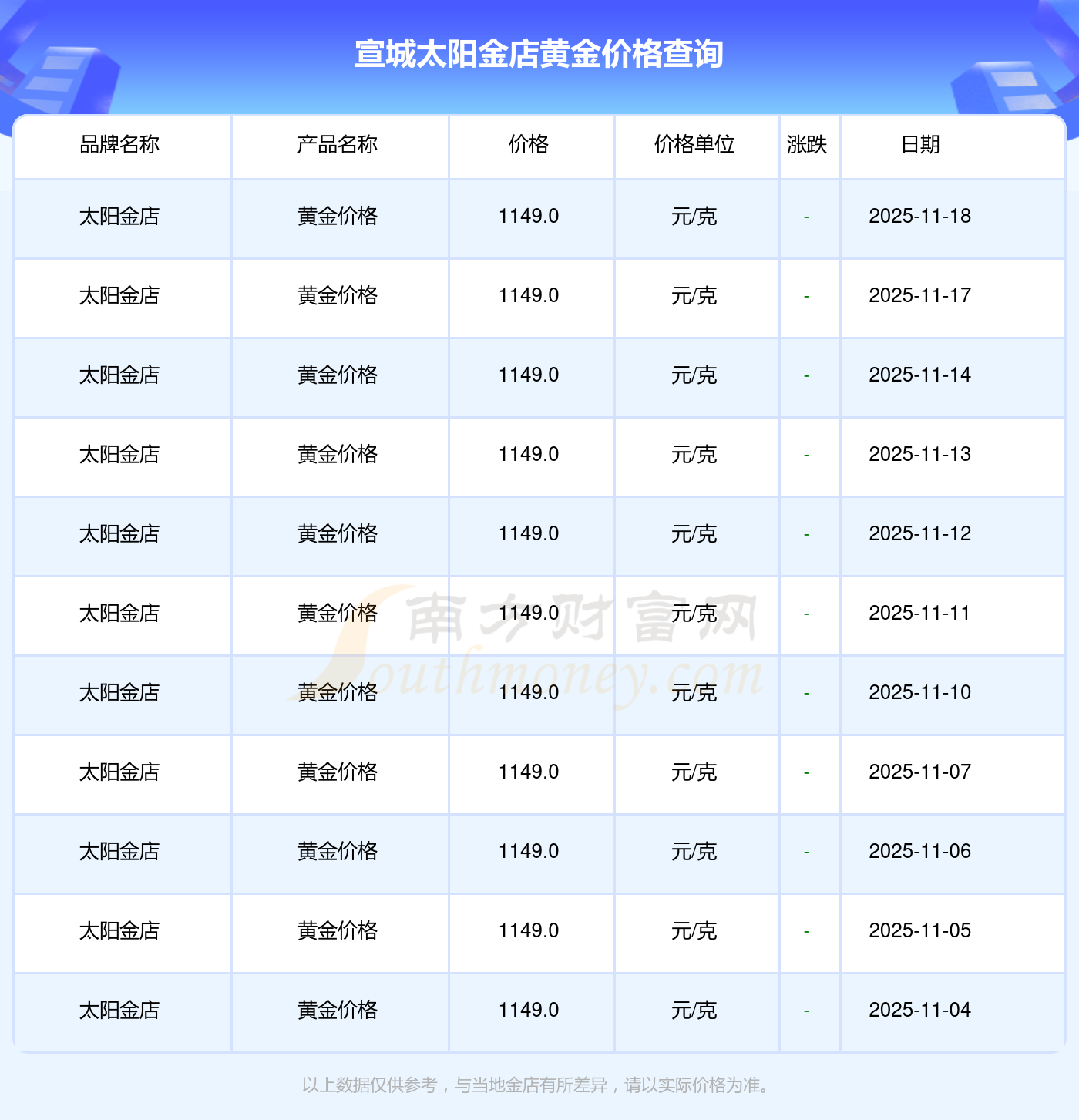 宣城太阳金店 2025年11月18日的黄金价格价位为 1149.0元/克。