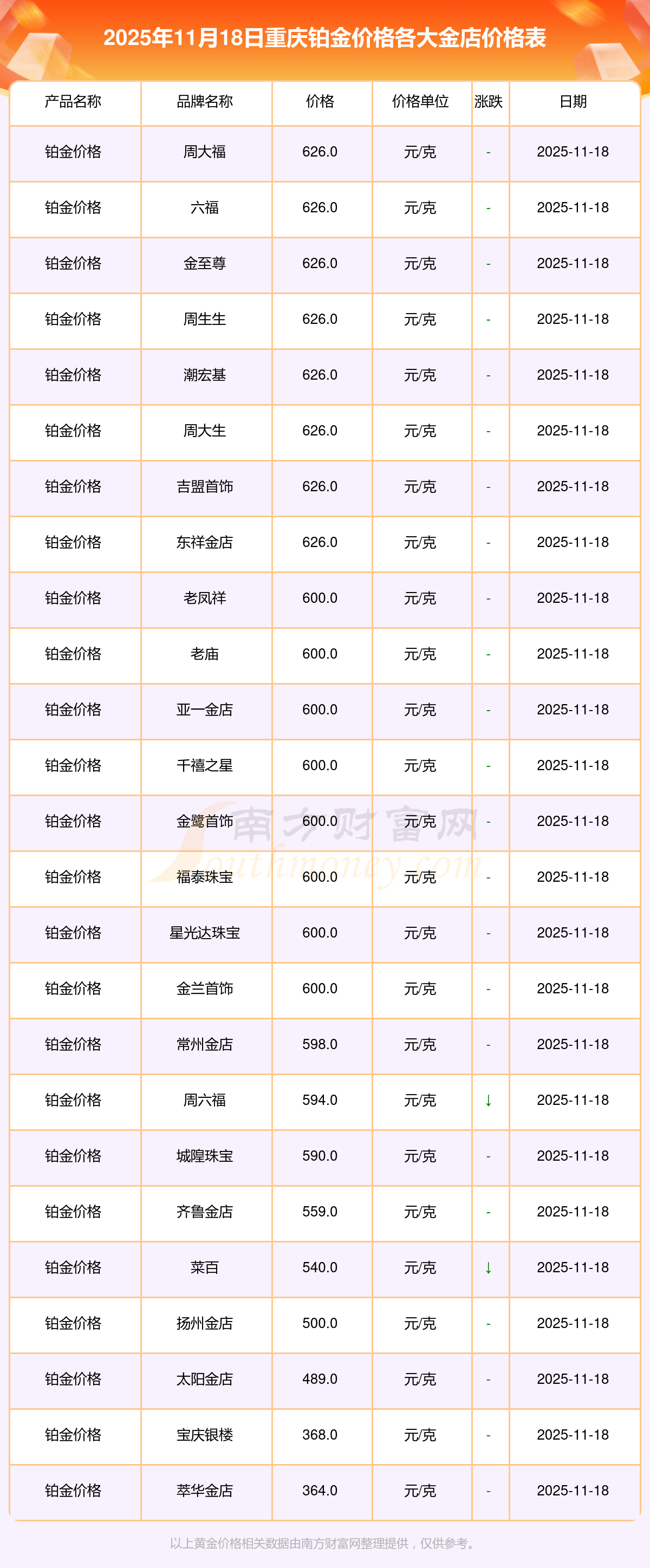 2025年11月18日重庆各大金店铂金价格最新价格查询来了:周大福1288.0元/克,周大福626.0元/克,周大福1288.0元/克,周大福44770.0,周大福17820.0,周大福40390.0,周大福1127.0元/克,老凤祥1285.0元/克,老凤祥600.0元/克,老凤祥1285.0元/克,周六福1257.0元/克。