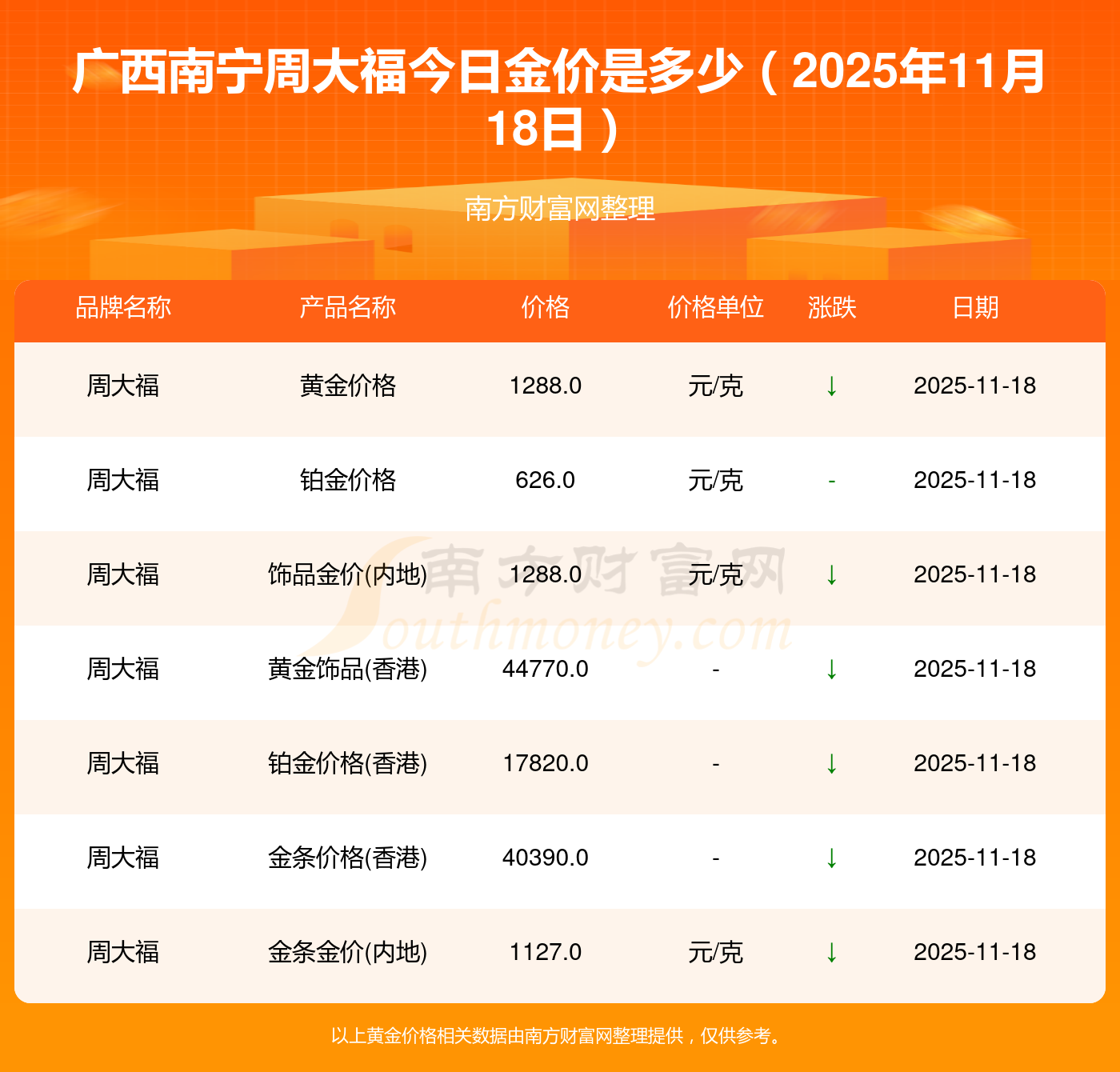 2025年11月18日广西南宁周大福黄金的单价,一克为多少?黄金价格1288.0元/克,铂金价格626.0元/克,饰品金价(内地)1288.0元/克,黄金饰品(香港)44770.0,铂金价格(香港)17820.0,金条价格(香港)40390.0,金条金价(内地)1127.0元/克,黄金价格1285.0元/克,铂金价格600.0元/克,足金价格1285.0元/克,黄金价格1257.0元/克。