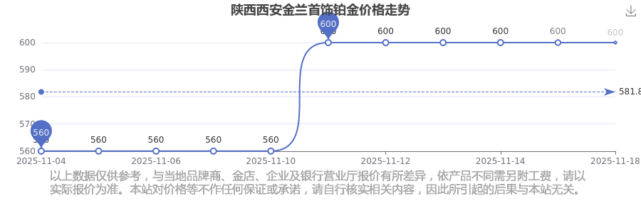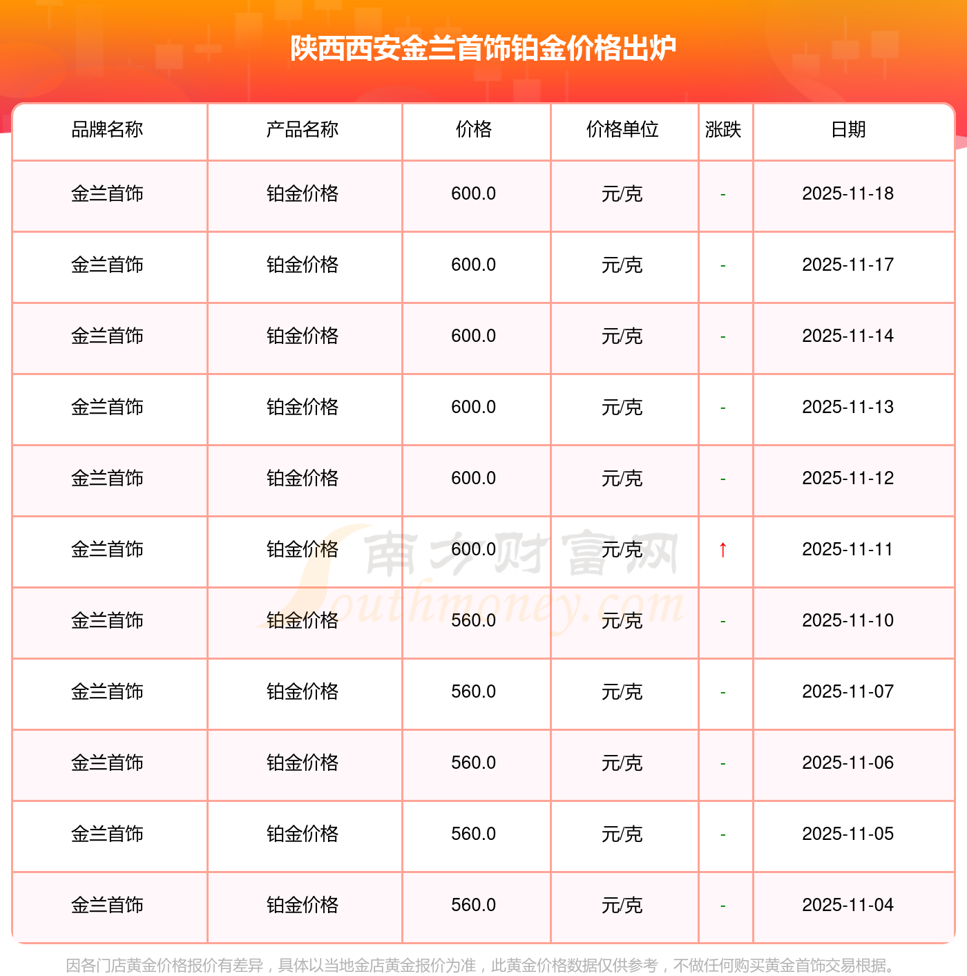 陕西西安金兰首饰在 2025年11月18日,铂金价格的售卖价格是 600.0元/克。