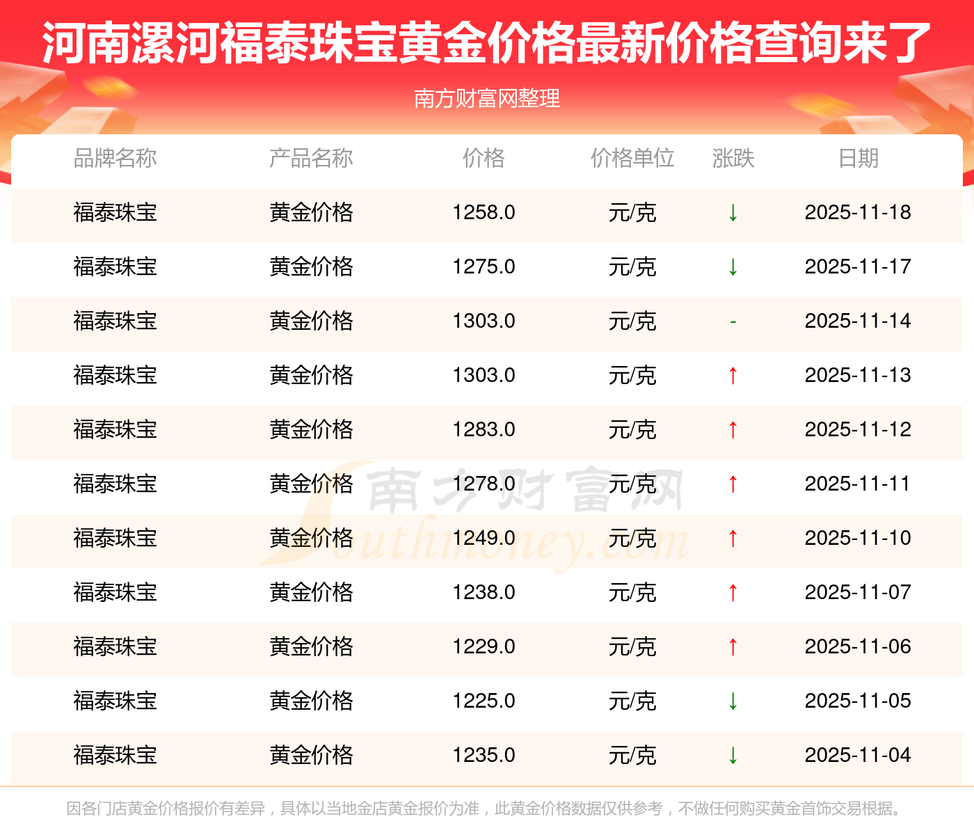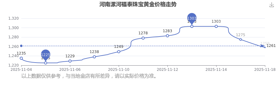 2025年11月18日当天,河南漯河福泰珠宝黄金价格的单价是 1258.0元/克。