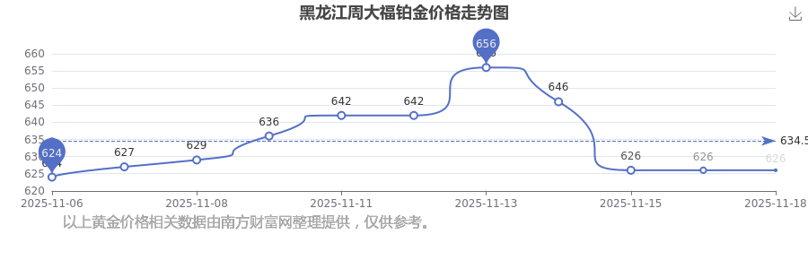 2025年11月18日黑龙江周大福铂金价格为626.0元/克。