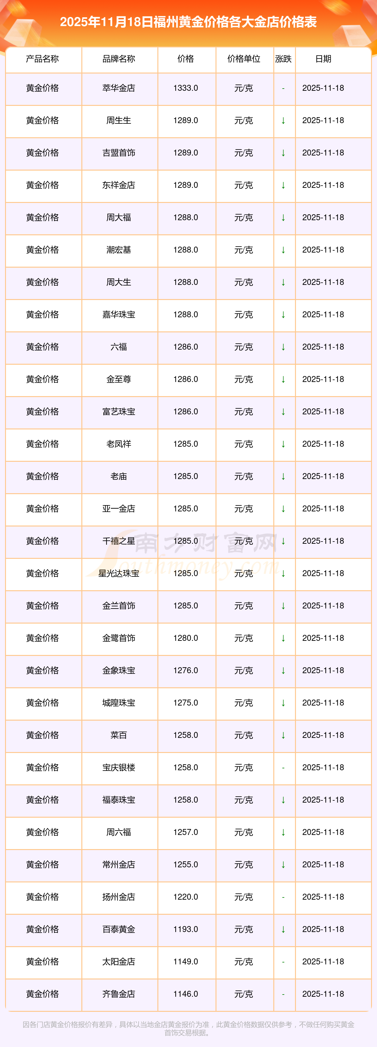 2025年11月18日福州各大金店黄金价格最新价格:周大福1288.0元/克,周大福626.0元/克,周大福1288.0元/克,周大福44770.0,周大福17820.0,周大福40390.0,周大福1127.0元/克,老凤祥1285.0元/克,老凤祥600.0元/克,老凤祥1285.0元/克,周六福1257.0元/克。