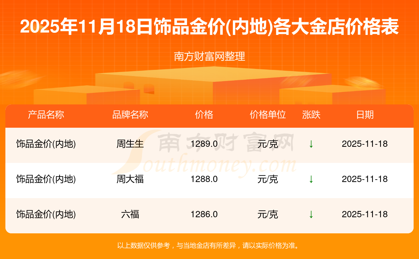 今天是2025年11月18日,周大福、周大福、周大福、周大福、周大福、周大福、周大福、老凤祥、老凤祥、老凤祥、周六福等各大金店品牌饰品金价(内地)最新价格如下:周大福1288.0元/克、周大福626.0元/克、周大福1288.0元/克、周大福44770.0、周大福17820.0、周大福40390.0、周大福1127.0元/克、老凤祥1285.0元/克、老凤祥600.0元/克、老凤祥1285.0元/克、周六福1257.0元/克。
