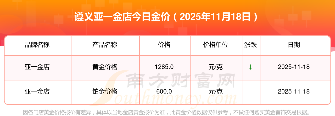 2025年11月18日遵义亚一金店一克黄金的售价是多少:黄金价格1288.0元/克,铂金价格626.0元/克,饰品金价(内地)1288.0元/克,黄金饰品(香港)44770.0,铂金价格(香港)17820.0,金条价格(香港)40390.0,金条金价(内地)1127.0元/克,黄金价格1285.0元/克,铂金价格600.0元/克,足金价格1285.0元/克,黄金价格1257.0元/克。