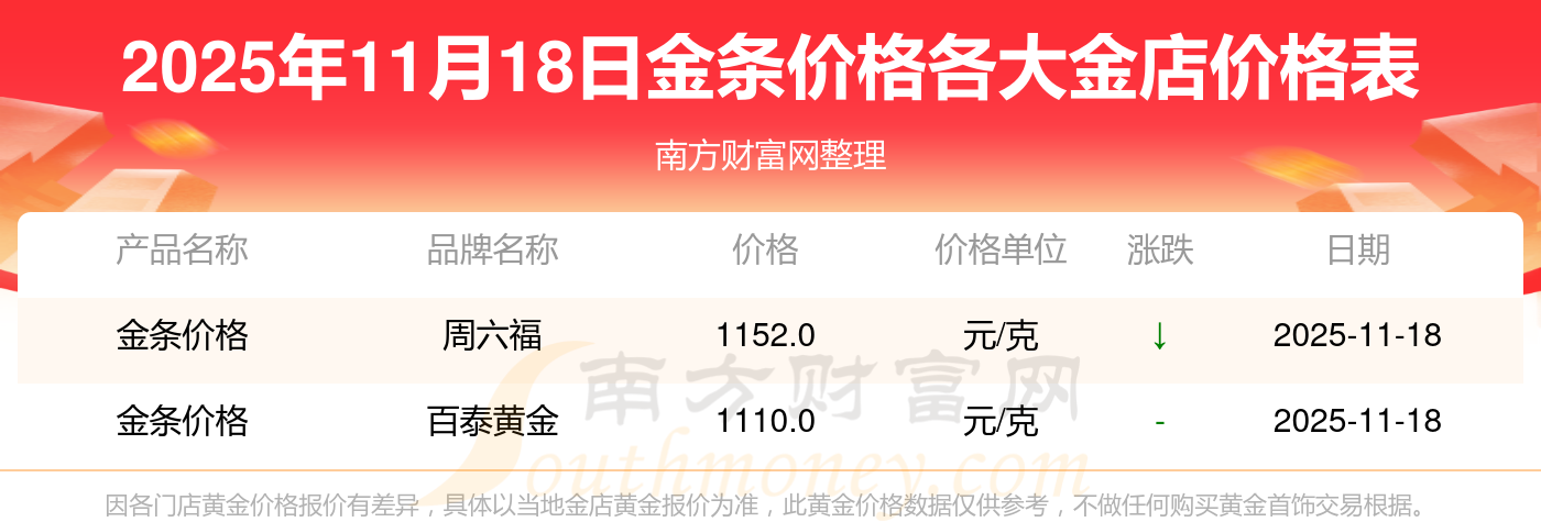 2025年11月18日周大福、周大福、周大福、周大福、周大福、周大福、周大福、老凤祥、老凤祥、老凤祥、周六福等各大金店品牌金条价格最新价格如下:周大福黄金价格1288.0元/克,周大福铂金价格626.0元/克,周大福饰品金价(内地)1288.0元/克,周大福黄金饰品(香港)44770.0,周大福铂金价格(香港)17820.0,周大福金条价格(香港)40390.0,周大福金条金价(内地)1127.0元/克,老凤祥黄金价格1285.0元/克,老凤祥铂金价格600.0元/克,老凤祥足金价格1285.0元/克,周六福黄金价格1257.0元/克。