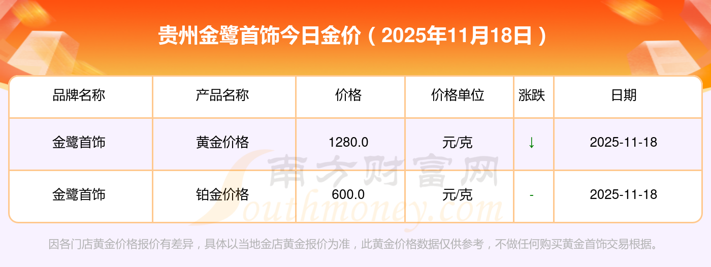 想知道当下黄金价格,今天黄金一克卖多少钱呢?2025年11月18日贵州金鹭首饰黄金一克的市场行情价是多少?黄金价格1288.0元/克,铂金价格626.0元/克,饰品金价(内地)1288.0元/克,黄金饰品(香港)44770.0,铂金价格(香港)17820.0,金条价格(香港)40390.0,金条金价(内地)1127.0元/克,黄金价格1285.0元/克,铂金价格600.0元/克,足金价格1285.0元/克,黄金价格1257.0元/克。