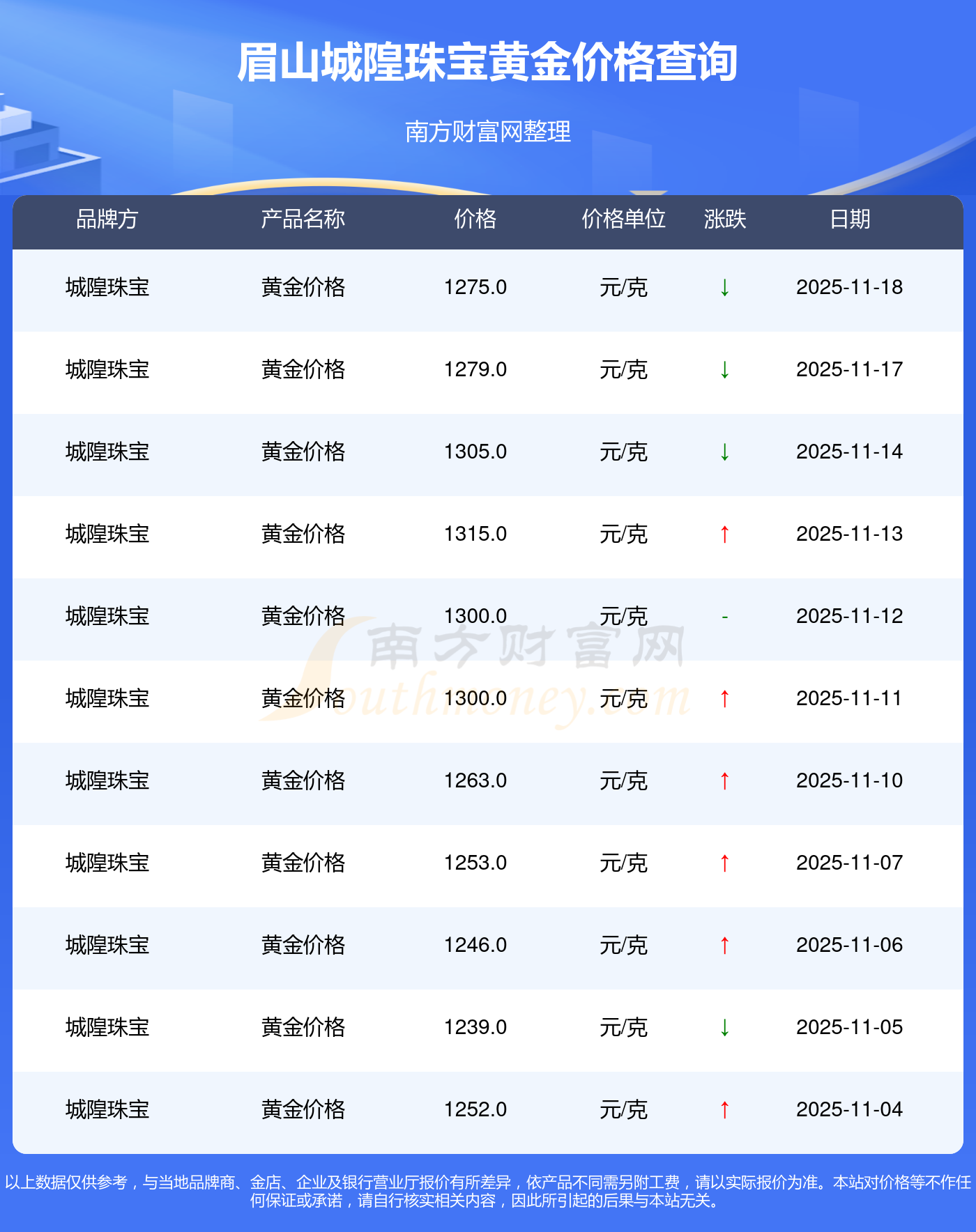 (2025年11月18日)今日眉山城隍珠宝黄金价格是1275.0元/克。