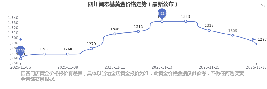 (2025年11月18日)四川潮宏基黄金价格现在为1288.0元/克。