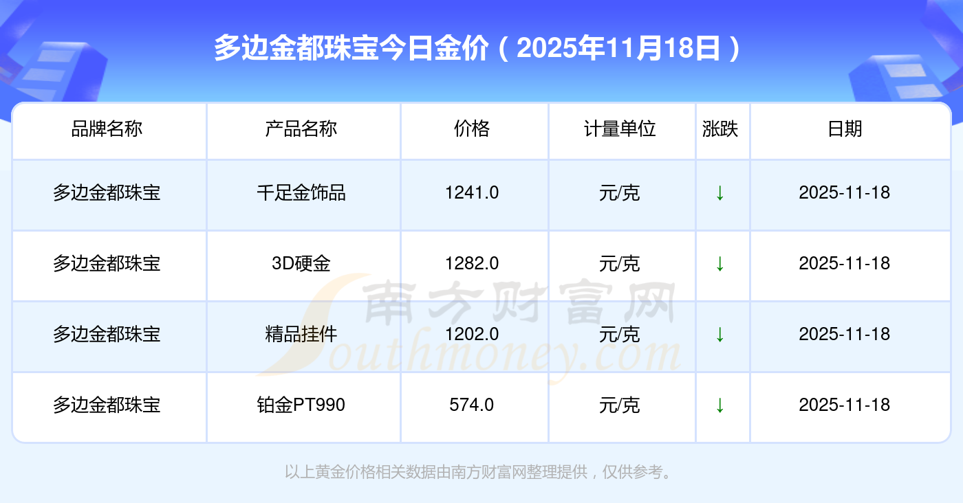现在多边金都珠宝黄金价格是多少钱1克_2025年多边金都珠宝今日金价是多少钱一克,最新多边金都珠宝查询,2025年11月18日多边金都珠宝铂金PT990现在每克多少钱?最新多边金都珠宝铂金PT990报价公布,一起来看看吧!