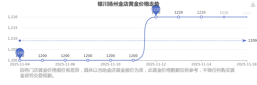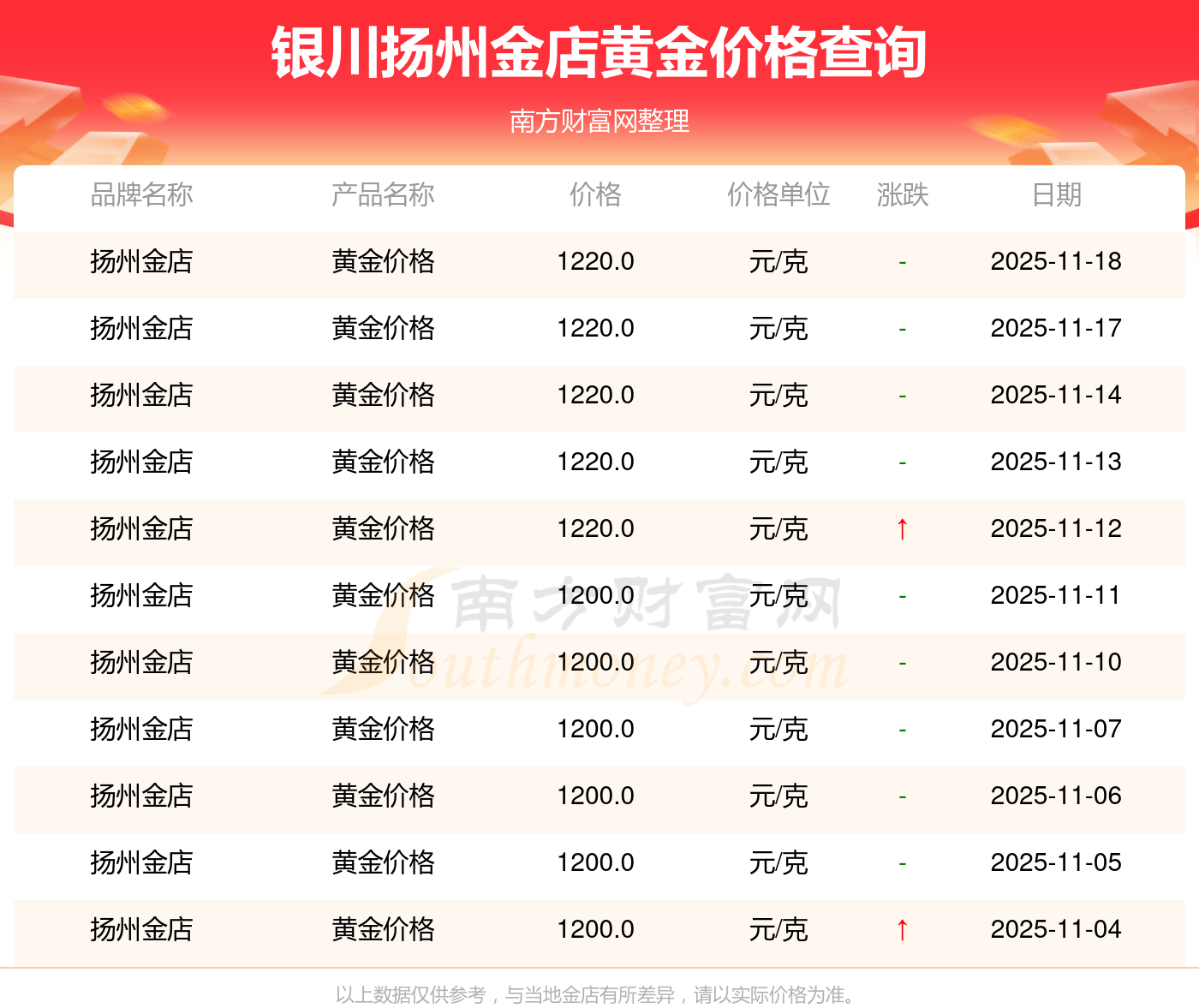 1220.0元/克,此乃银川扬州金店于 2025年11月18日黄金价格的挂牌价格。