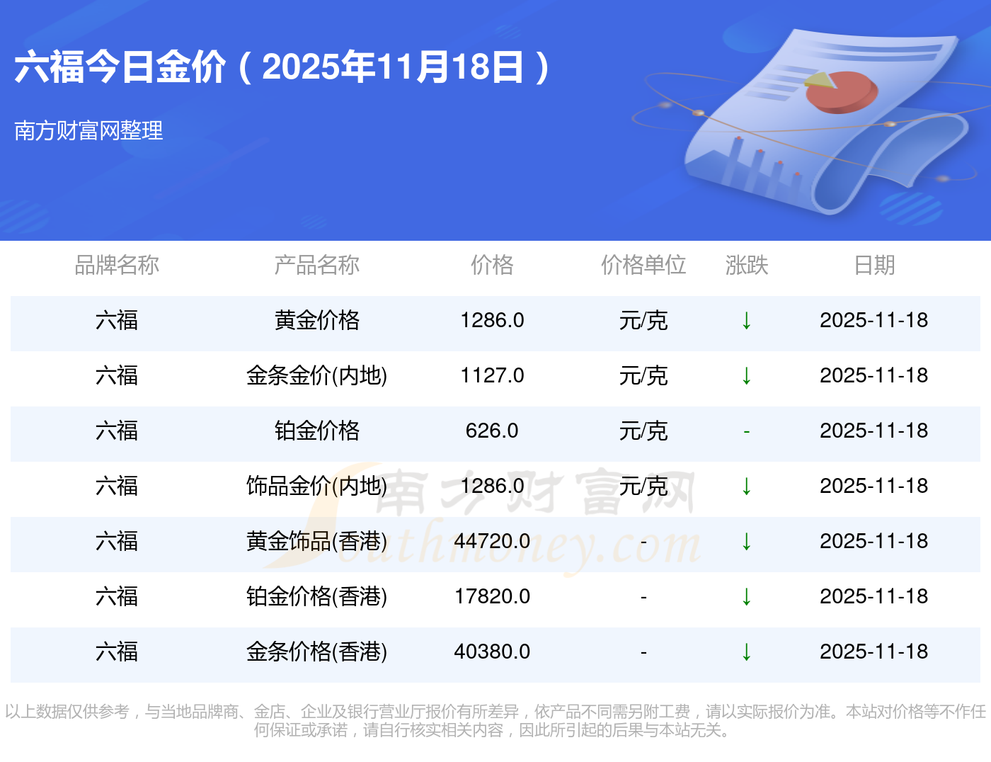 以上数据仅供参考,与当地品牌商、金店、企业及银行营业厅报价有所差异,依产品不同需另附工费,请以实际报价为准。本站对价格等不作任何保证或承诺,请自行核实相关内容,因此所引起的后果与本站无关。