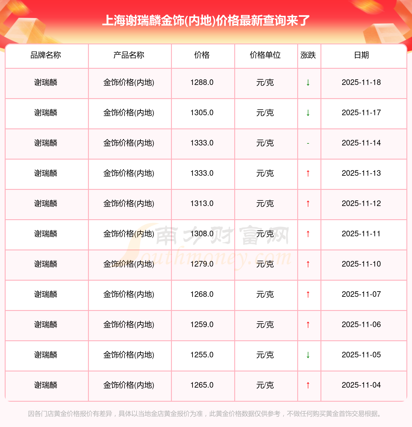 今日(2025年11月18日),上海谢瑞麟金饰价格(内地)每克的价值为1288.0元/克。