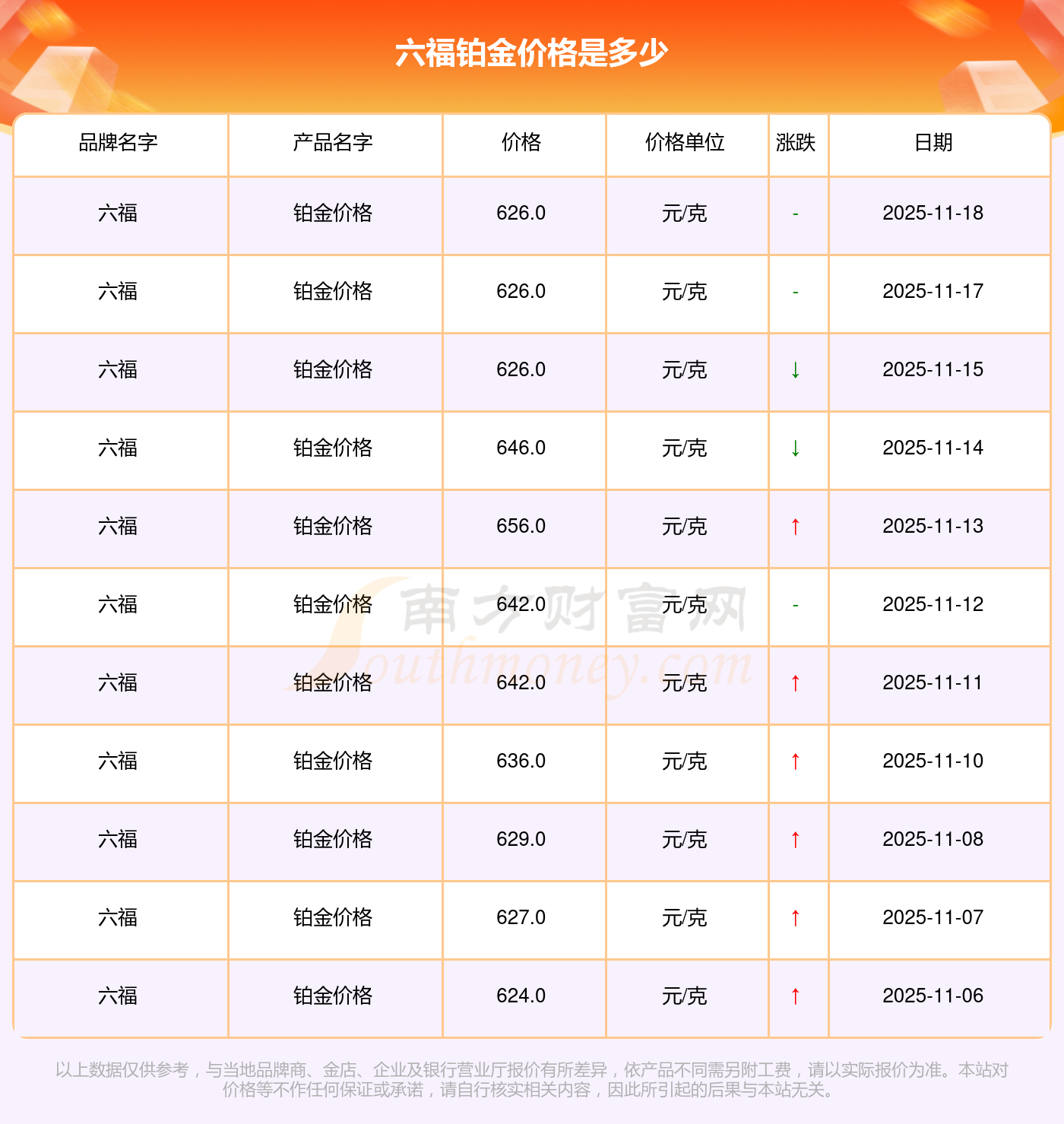 2025年11月18日六福铂金价格最新为626.0元/克。