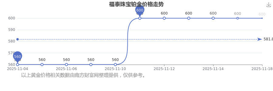 据了解,今日福泰珠宝 铂金价格的最新价格为600.0元/克。