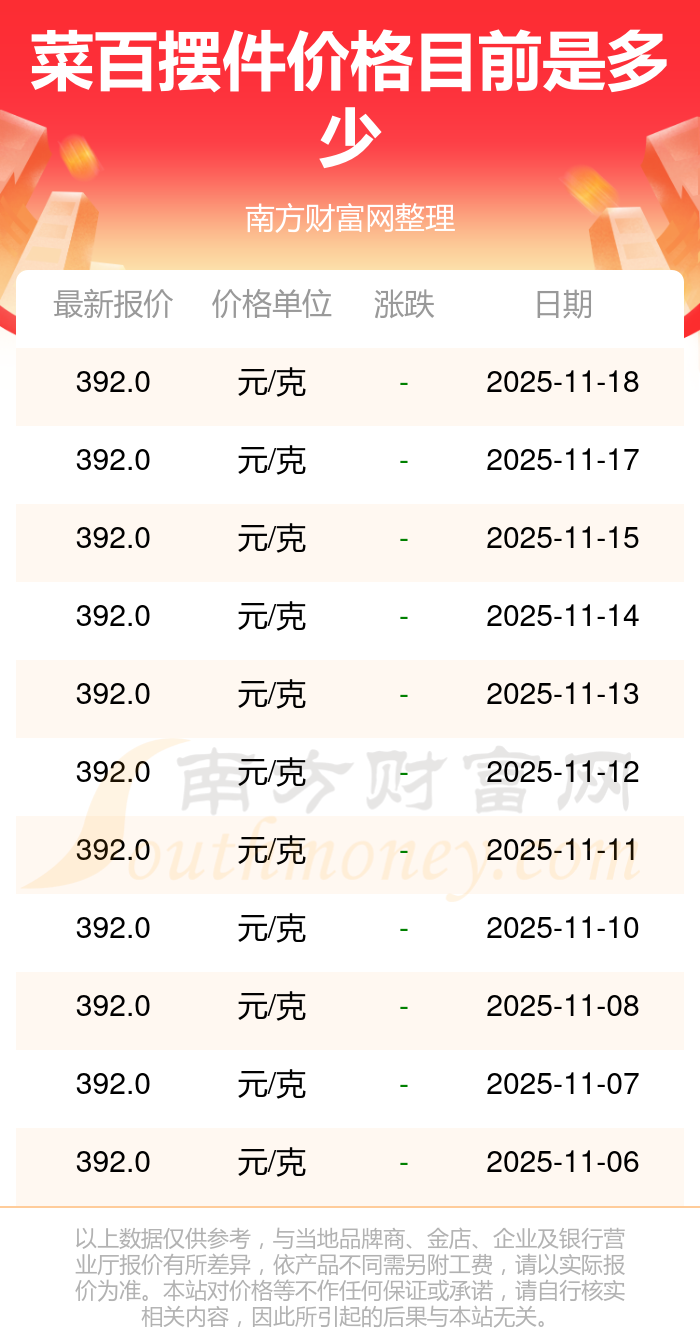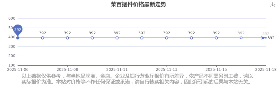 菜百 摆件价格在今日更新至392.0元/克。