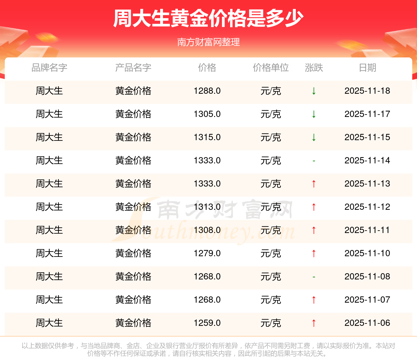 想查询今日黄金价格,当下黄金一克具体售价几何?一般而言,黄金每克的售价是多少呢?今日(2025年11月19日),周大生黄金价格最新价格是1288.0元/克。